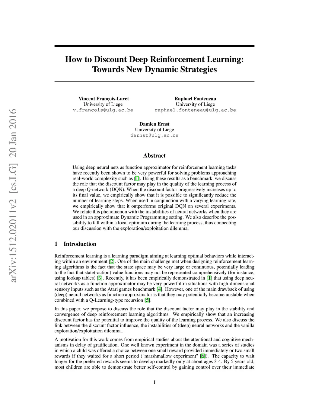 Using deep neural nets as function approximator for reinforcement learning tasks have recently been shown to be very powerful for solving problems approaching real-world complexity. Using these results as a benchmark, we discuss the role that the discount factor may play in the quality of the learning process of a deep Q-network (DQN). When the discount factor progressively increases up to its final value, we empirically show that it is possible to significantly reduce the number of learning steps. When used in conjunction with a varying learning rate, we empirically show that it outperforms original DQN on several experiments. We relate this phenomenon with the instabilities of neural networks when they are used in an approximate Dynamic Programming setting. We also describe the possibility to fall within a local optimum during the learning process, thus connecting our discussion with the exploration/exploitation dilemma.