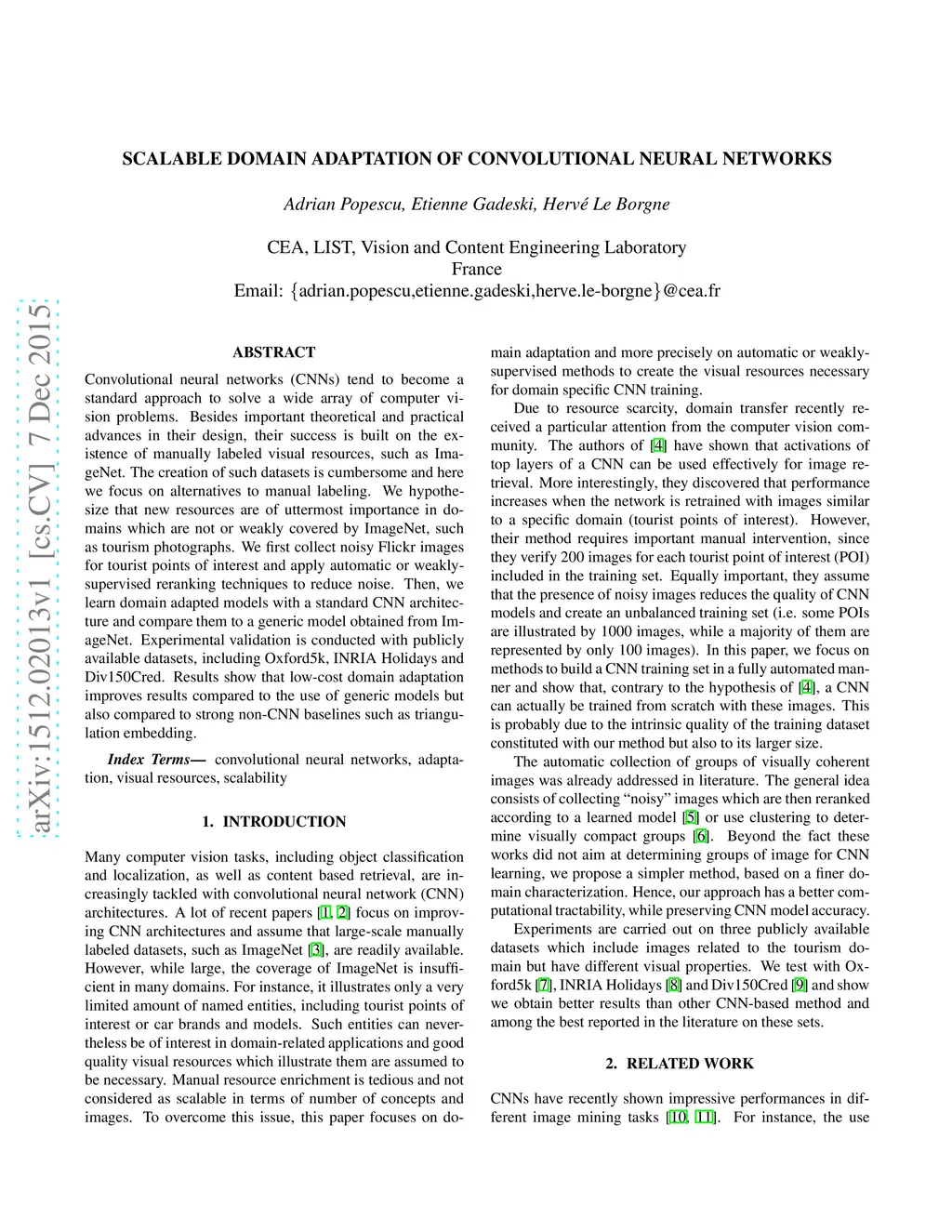 Convolutional neural networks (CNNs) tend to become a standard approach to solve a wide array of computer vision problems. Besides important theoretical and practical advances in their design, their success is built on the existence of manually labeled visual resources, such as ImageNet. The creation of such datasets is cumbersome and here we focus on alternatives to manual labeling. We hypothesize that new resources are of uttermost importance in domains which are not or weakly covered by ImageNet, such as tourism photographs. We first collect noisy Flickr images for tourist points of interest and apply automatic or weakly-supervised reranking techniques to reduce noise. Then, we learn domain adapted models with a standard CNN architecture and compare them to a generic model obtained from ImageNet. Experimental validation is conducted with publicly available datasets, including Oxford5k, INRIA Holidays and Div150Cred. Results show that low-cost domain adaptation improves results compared to the use of generic models but also compared to strong non-CNN baselines such as triangulation embedding.