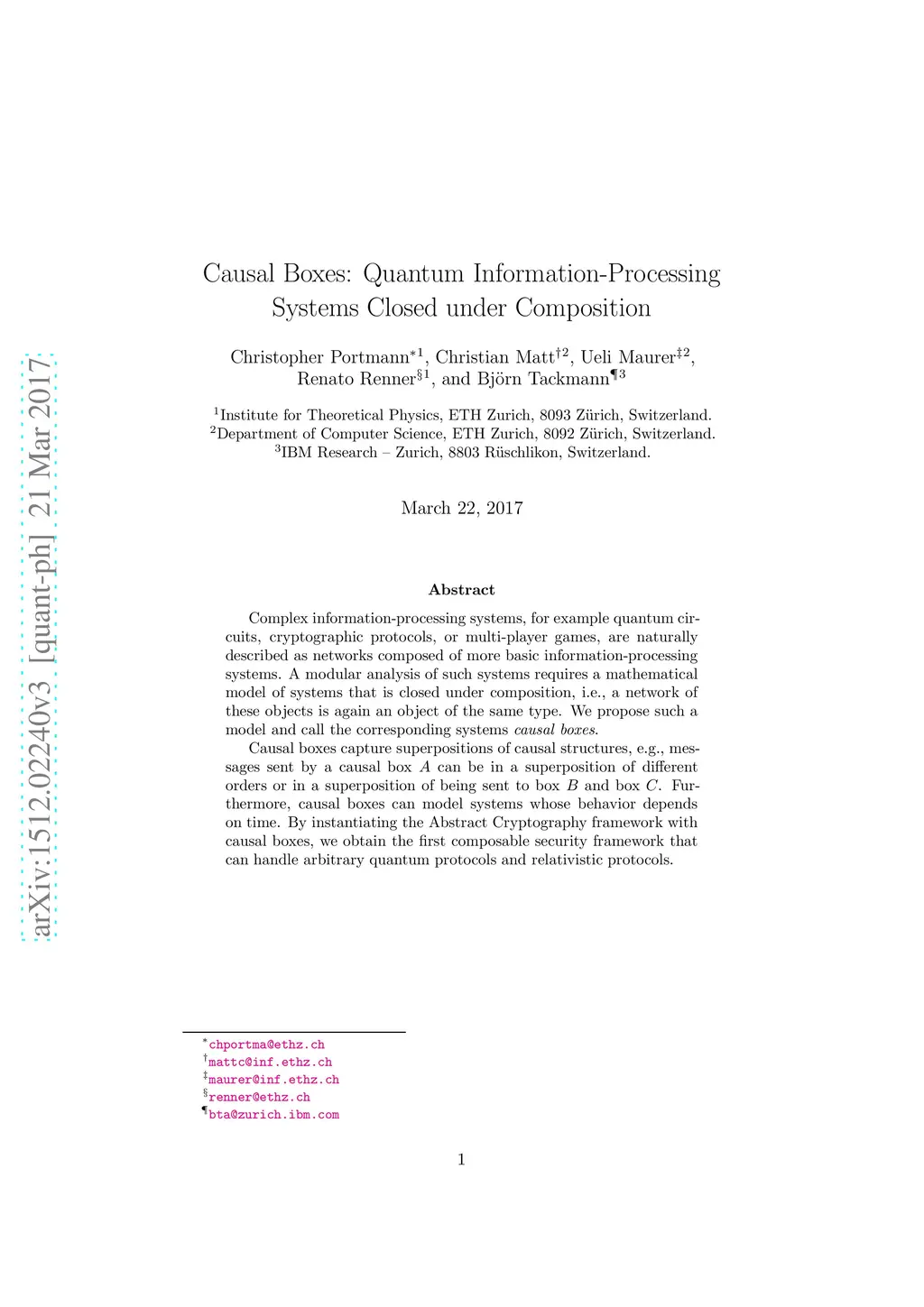 Complex information-processing systems, for example quantum circuits, cryptographic protocols, or multi-player games, are naturally described as networks composed of more basic information-processing systems. A modular analysis of such systems requires a mathematical model of systems that is closed under composition, i.e., a network of these objects is again an object of the same type. We propose such a model and call the corresponding systems causal boxes. Causal boxes capture superpositions of causal structures, e.g., messages sent by a causal box A can be in a superposition of different orders or in a superposition of being sent to box B and box C. Furthermore, causal boxes can model systems whose behavior depends on time. By instantiating the Abstract Cryptography framework with causal boxes, we obtain the first composable security framework that can handle arbitrary quantum protocols and relativistic protocols.