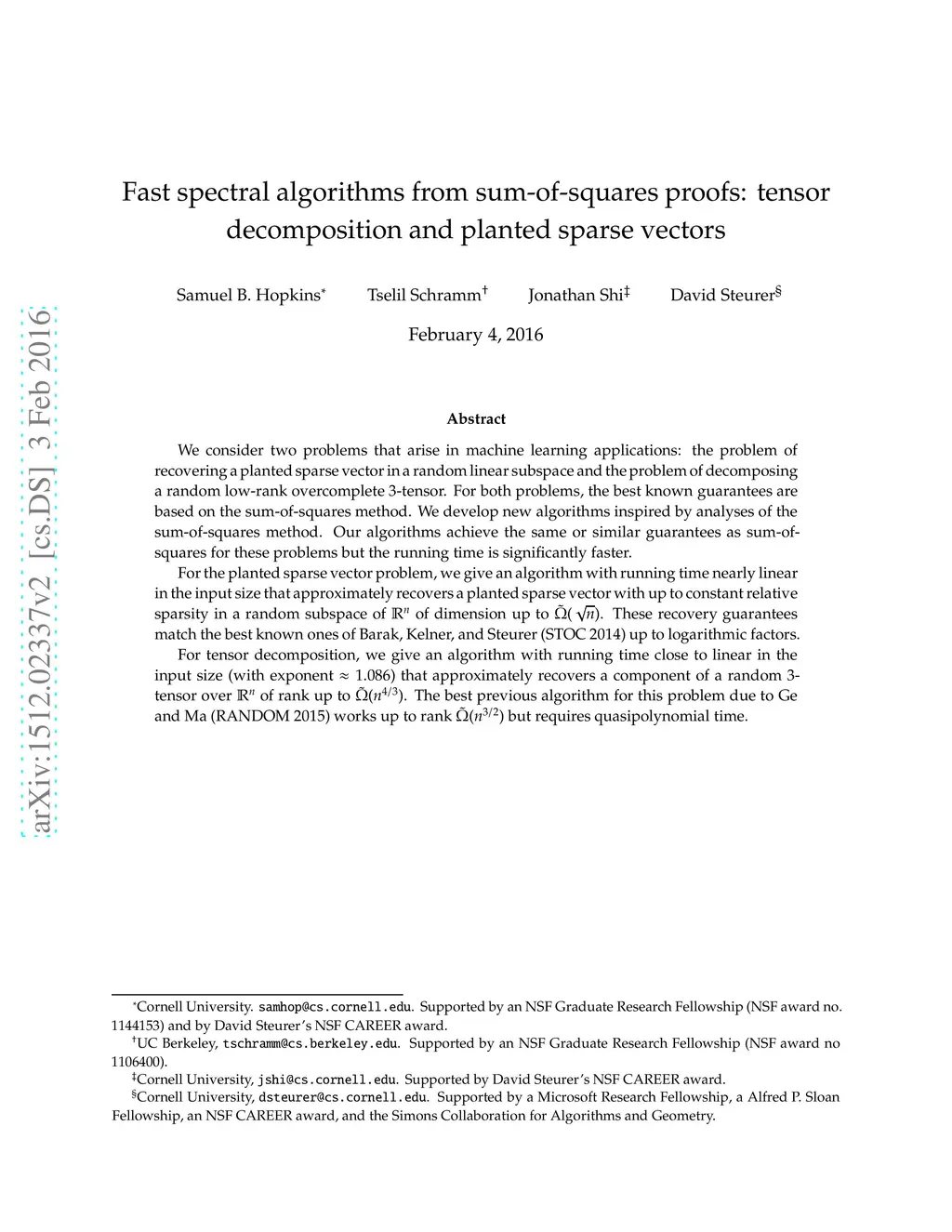 We consider two problems that arise in machine learning applications: the problem of recovering a planted sparse vector in a random linear subspace and the problem of decomposing a random low-rank overcomplete 3-tensor. For both problems, the best known guarantees are based on the sum-of-squares method. We develop new algorithms inspired by analyses of the sum-of-squares method. Our algorithms achieve the same or similar guarantees as sum-of-squares for these problems but the running time is significantly faster. For the planted sparse vector problem, we give an algorithm with running time nearly linear in the input size that approximately recovers a planted sparse vector with up to constant relative sparsity in a random subspace of of dimension up to . These recovery guarantees match the best known ones of Barak, Kelner, and Steurer (STOC 2014) up to logarithmic factors. For tensor decomposition, we give an algorithm with running time close to linear in the input size (with exponent ) that approximately recovers a component of a random 3-tensor over of rank up to . The best previous algorithm for this problem due to Ge and Ma (RANDOM 2015) works up to rank but requires quasipolynomial time.