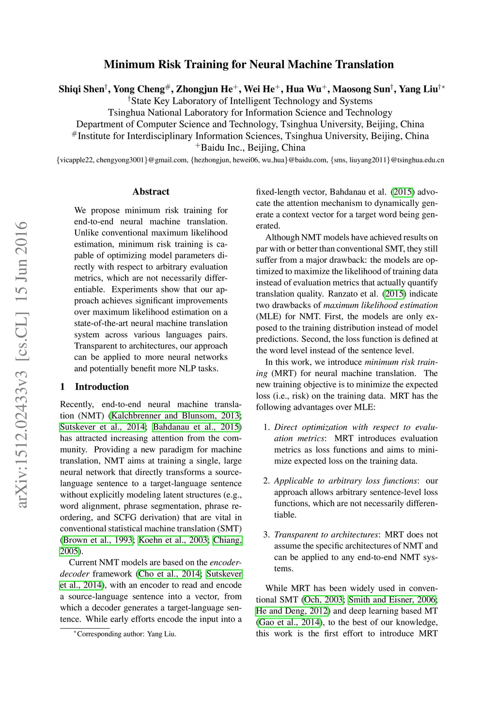 We propose minimum risk training for end-to-end neural machine translation. Unlike conventional maximum likelihood estimation, minimum risk training is capable of optimizing model parameters directly with respect to arbitrary evaluation metrics, which are not necessarily differentiable. Experiments show that our approach achieves significant improvements over maximum likelihood estimation on a state-of-the-art neural machine translation system across various languages pairs. Transparent to architectures, our approach can be applied to more neural networks and potentially benefit more NLP tasks.