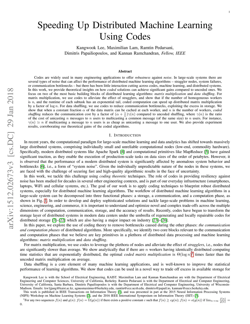 Codes are widely used in many engineering applications to offer robustness against noise. In large-scale systems there are several types of noise that can affect the performance of distributed machine learning algorithms -- straggler nodes, system failures, or communication bottlenecks -- but there has been little interaction cutting across codes, machine learning, and distributed systems. In this work, we provide theoretical insights on how coded solutions can achieve significant gains compared to uncoded ones. We focus on two of the most basic building blocks of distributed learning algorithms: matrix multiplication and data shuffling. For matrix multiplication, we use codes to alleviate the effect of stragglers, and show that if the number of homogeneous workers is , and the runtime of each subtask has an exponential tail, coded computation can speed up distributed matrix multiplication by a factor of . For data shuffling, we use codes to reduce communication bottlenecks, exploiting the excess in storage. We show that when a constant fraction of the data matrix can be cached at each worker, and is the number of workers, \emph{coded shuffling} reduces the communication cost by a factor of compared to uncoded shuffling, where is the ratio of the cost of unicasting messages to users to multicasting a common message (of the same size) to users. For instance, if multicasting a message to users is as cheap as unicasting a message to one user. We also provide experiment results, corroborating our theoretical gains of the coded algorithms.