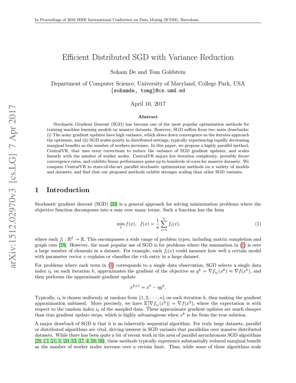 Stochastic Gradient Descent (SGD) has become one of the most popular optimization methods for training machine learning models on massive datasets. However, SGD suffers from two main drawbacks: (i) The noisy gradient updates have high variance, which slows down convergence as the iterates approach the optimum, and (ii) SGD scales poorly in distributed settings, typically experiencing rapidly decreasing marginal benefits as the number of workers increases. In this paper, we propose a highly parallel method, CentralVR, that uses error corrections to reduce the variance of SGD gradient updates, and scales linearly with the number of worker nodes. CentralVR enjoys low iteration complexity, provably linear convergence rates, and exhibits linear performance gains up to hundreds of cores for massive datasets. We compare CentralVR to state-of-the-art parallel stochastic optimization methods on a variety of models and datasets, and find that our proposed methods exhibit stronger scaling than other SGD variants.