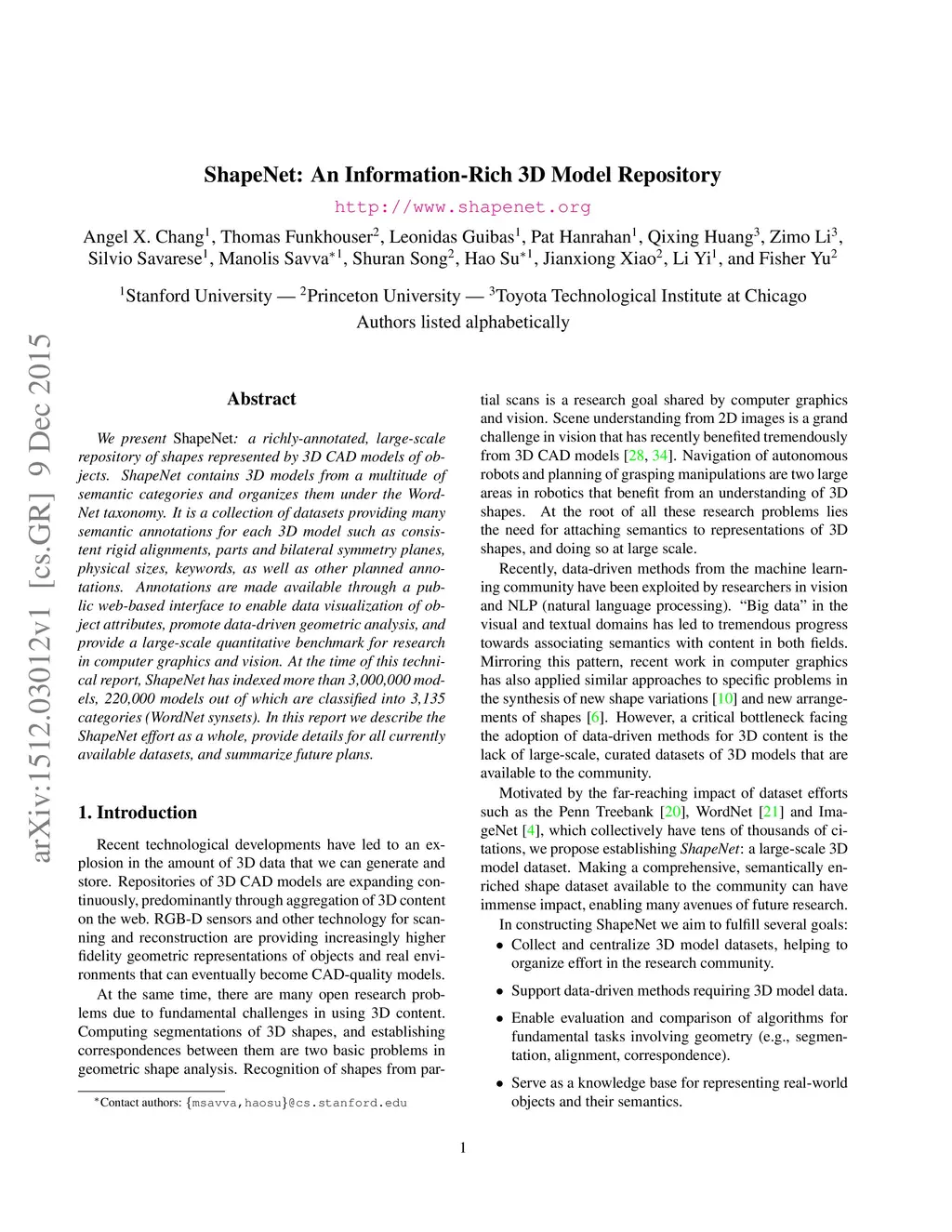 We present ShapeNet: a richly-annotated, large-scale repository of shapes represented by 3D CAD models of objects. ShapeNet contains 3D models from a multitude of semantic categories and organizes them under the WordNet taxonomy. It is a collection of datasets providing many semantic annotations for each 3D model such as consistent rigid alignments, parts and bilateral symmetry planes, physical sizes, keywords, as well as other planned annotations. Annotations are made available through a public web-based interface to enable data visualization of object attributes, promote data-driven geometric analysis, and provide a large-scale quantitative benchmark for research in computer graphics and vision. At the time of this technical report, ShapeNet has indexed more than 3,000,000 models, 220,000 models out of which are classified into 3,135 categories (WordNet synsets). In this report we describe the ShapeNet effort as a whole, provide details for all currently available datasets, and summarize future plans.