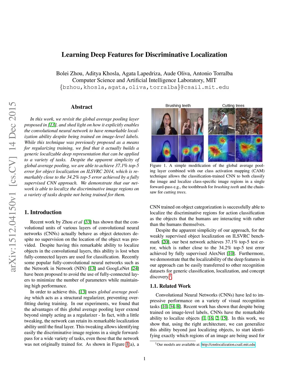 In this work, we revisit the global average pooling layer proposed in [13], and shed light on how it explicitly enables the convolutional neural network to have remarkable localization ability despite being trained on image-level labels. While this technique was previously proposed as a means for regularizing training, we find that it actually builds a generic localizable deep representation that can be applied to a variety of tasks. Despite the apparent simplicity of global average pooling, we are able to achieve 37.1% top-5 error for object localization on ILSVRC 2014, which is remarkably close to the 34.2% top-5 error achieved by a fully supervised CNN approach. We demonstrate that our network is able to localize the discriminative image regions on a variety of tasks despite not being trained for them