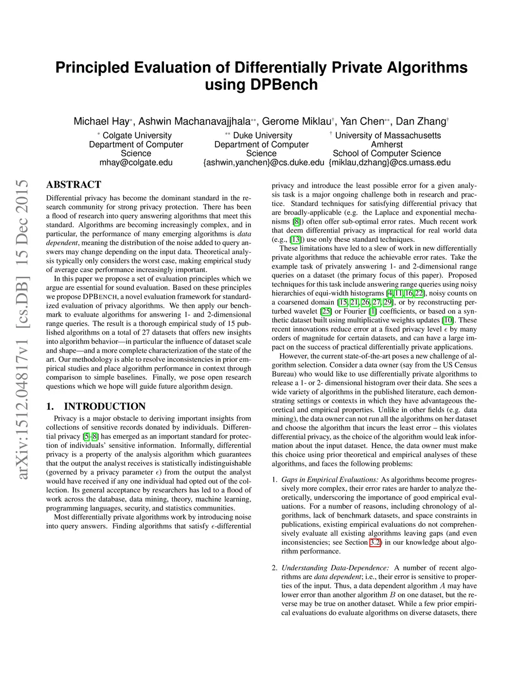Differential privacy has become the dominant standard in the research community for strong privacy protection. There has been a flood of research into query answering algorithms that meet this standard. Algorithms are becoming increasingly complex, and in particular, the performance of many emerging algorithms is {\em data dependent}, meaning the distribution of the noise added to query answers may change depending on the input data. Theoretical analysis typically only considers the worst case, making empirical study of average case performance increasingly important. In this paper we propose a set of evaluation principles which we argue are essential for sound evaluation. Based on these principles we propose DPBench, a novel evaluation framework for standardized evaluation of privacy algorithms. We then apply our benchmark to evaluate algorithms for answering 1- and 2-dimensional range queries. The result is a thorough empirical study of 15 published algorithms on a total of 27 datasets that offers new insights into algorithm behavior---in particular the influence of dataset scale and shape---and a more complete characterization of the state of the art. Our methodology is able to resolve inconsistencies in prior empirical studies and place algorithm performance in context through comparison to simple baselines. Finally, we pose open research questions which we hope will guide future algorithm design.