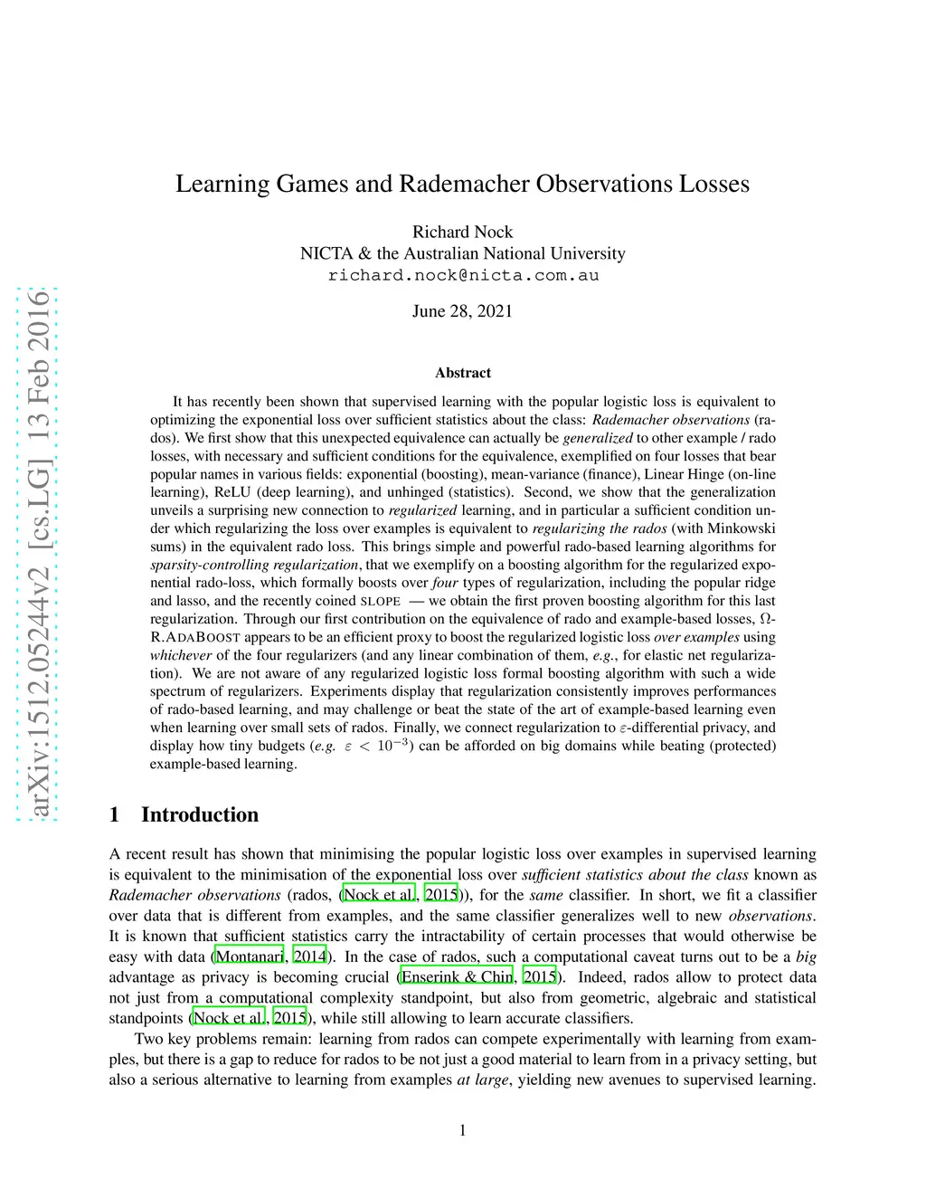 It has recently been shown that supervised learning with the popular logistic loss is equivalent to optimizing the exponential loss over sufficient statistics about the class: Rademacher observations (rados). We first show that this unexpected equivalence can actually be generalized to other example / rado losses, with necessary and sufficient conditions for the equivalence, exemplified on four losses that bear popular names in various fields: exponential (boosting), mean-variance (finance), Linear Hinge (on-line learning), ReLU (deep learning), and unhinged (statistics). Second, we show that the generalization unveils a surprising new connection to regularized learning, and in particular a sufficient condition under which regularizing the loss over examples is equivalent to regularizing the rados (with Minkowski sums) in the equivalent rado loss. This brings simple and powerful rado-based learning algorithms for sparsity-controlling regularization, that we exemplify on a boosting algorithm for the regularized exponential rado-loss, which formally boosts over four types of regularization, including the popular ridge and lasso, and the recently coined slope --- we obtain the first proven boosting algorithm for this last regularization. Through our first contribution on the equivalence of rado and example-based losses, Omega-R.AdaBoost~appears to be an efficient proxy to boost the regularized logistic loss over examples using whichever of the four regularizers. Experiments display that regularization consistently improves performances of rado-based learning, and may challenge or beat the state of the art of example-based learning even when learning over small sets of rados. Finally, we connect regularization to differential privacy, and display how tiny budgets can be afforded on big domains while beating (protected) example-based learning.