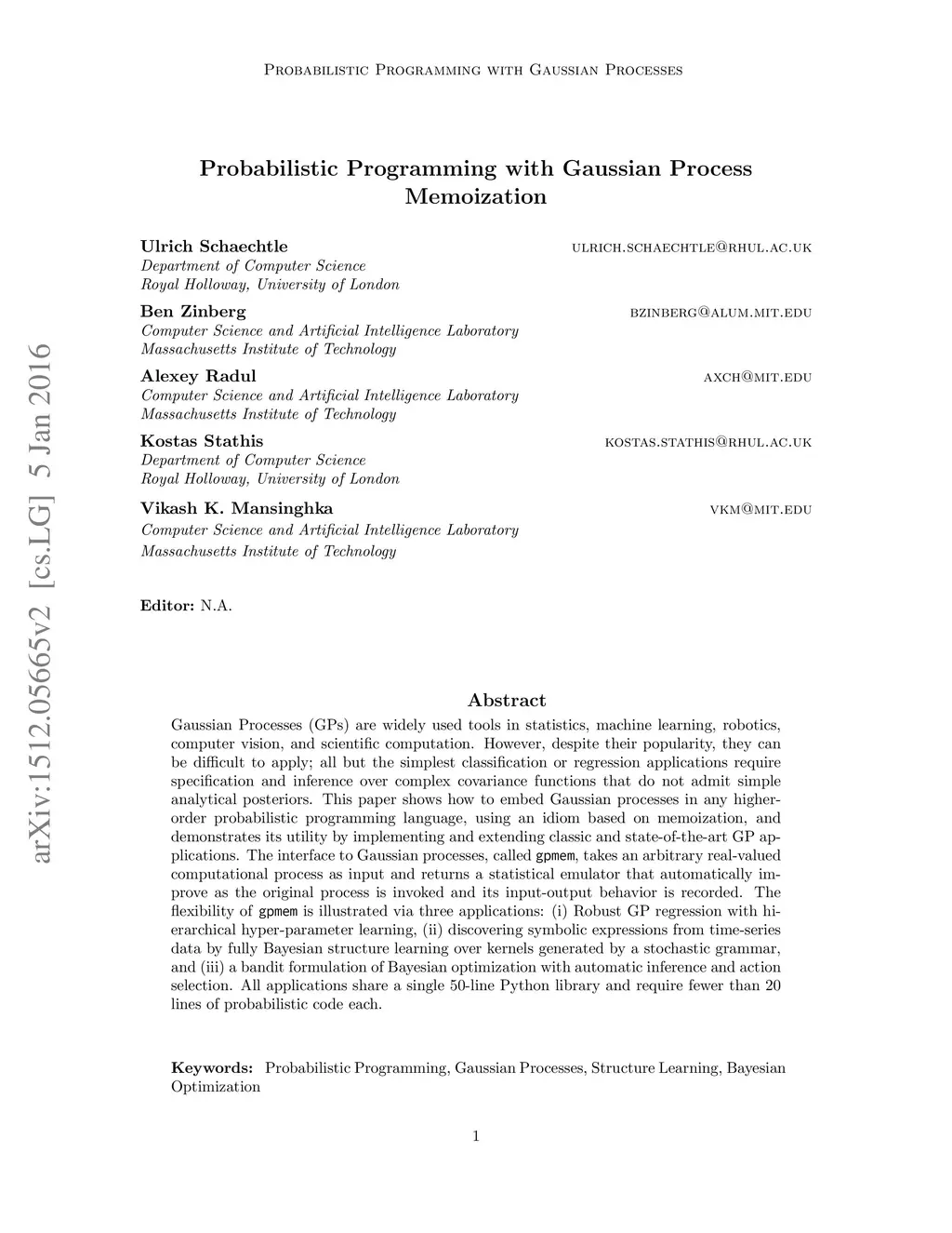 Gaussian Processes (GPs) are widely used tools in statistics, machine learning, robotics, computer vision, and scientific computation. However, despite their popularity, they can be difficult to apply; all but the simplest classification or regression applications require specification and inference over complex covariance functions that do not admit simple analytical posteriors. This paper shows how to embed Gaussian processes in any higher-order probabilistic programming language, using an idiom based on memoization, and demonstrates its utility by implementing and extending classic and state-of-the-art GP applications. The interface to Gaussian processes, called gpmem, takes an arbitrary real-valued computational process as input and returns a statistical emulator that automatically improve as the original process is invoked and its input-output behavior is recorded. The flexibility of gpmem is illustrated via three applications: (i) robust GP regression with hierarchical hyper-parameter learning, (ii) discovering symbolic expressions from time-series data by fully Bayesian structure learning over kernels generated by a stochastic grammar, and (iii) a bandit formulation of Bayesian optimization with automatic inference and action selection. All applications share a single 50-line Python library and require fewer than 20 lines of probabilistic code each.