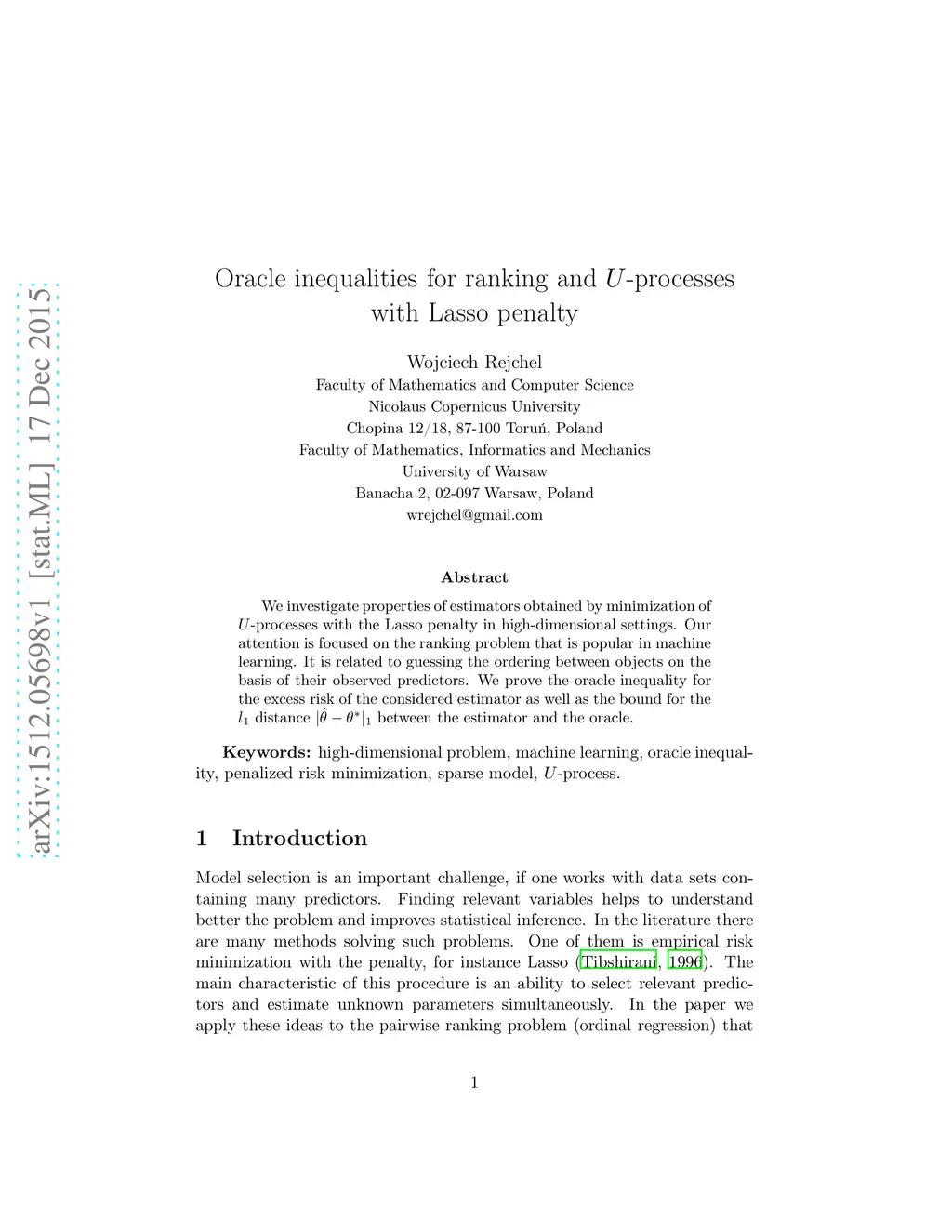 We investigate properties of estimators obtained by minimization of U-processes with the Lasso penalty in high-dimensional settings. Our attention is focused on the ranking problem that is popular in machine learning. It is related to guessing the ordering between objects on the basis of their observed predictors. We prove the oracle inequality for the excess risk of the considered estimator as well as the bound for the l1 distance between the estimator and the oracle.