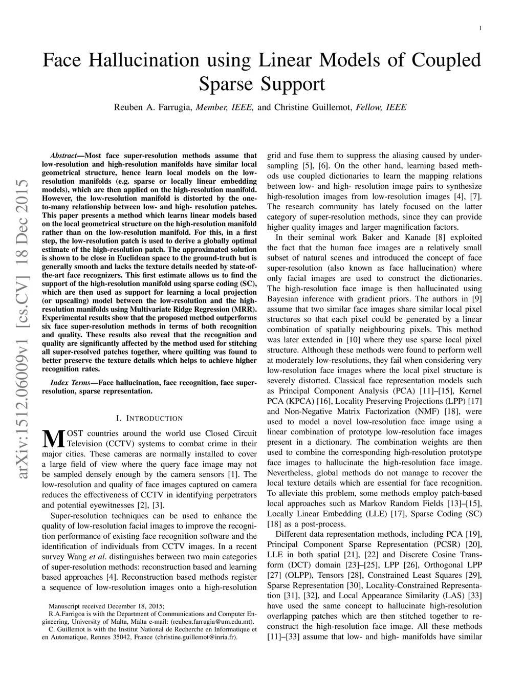 Most face super-resolution methods assume that low-resolution and high-resolution manifolds have similar local geometrical structure, hence learn local models on the lowresolution manifolds (e.g. sparse or locally linear embedding models), which are then applied on the high-resolution manifold. However, the low-resolution manifold is distorted by the oneto-many relationship between low- and high- resolution patches. This paper presents a method which learns linear models based on the local geometrical structure on the high-resolution manifold rather than on the low-resolution manifold. For this, in a first step, the low-resolution patch is used to derive a globally optimal estimate of the high-resolution patch. The approximated solution is shown to be close in Euclidean space to the ground-truth but is generally smooth and lacks the texture details needed by state-ofthe-art face recognizers. This first estimate allows us to find the support of the high-resolution manifold using sparse coding (SC), which are then used as support for learning a local projection (or upscaling) model between the low-resolution and the highresolution manifolds using Multivariate Ridge Regression (MRR). Experimental results show that the proposed method outperforms six face super-resolution methods in terms of both recognition and quality. These results also reveal that the recognition and quality are significantly affected by the method used for stitching all super-resolved patches together, where quilting was found to better preserve the texture details which helps to achieve higher recognition rates.