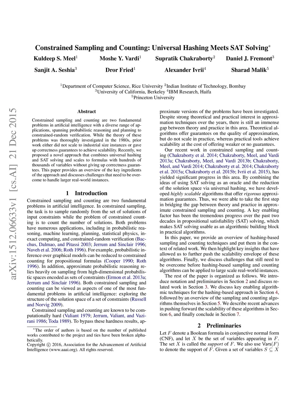 Constrained sampling and counting are two fundamental problems in artificial intelligence with a diverse range of applications, spanning probabilistic reasoning and planning to constrained-random verification. While the theory of these problems was thoroughly investigated in the 1980s, prior work either did not scale to industrial size instances or gave up correctness guarantees to achieve scalability. Recently, we proposed a novel approach that combines universal hashing and SAT solving and scales to formulas with hundreds of thousands of variables without giving up correctness guarantees. This paper provides an overview of the key ingredients of the approach and discusses challenges that need to be overcome to handle larger real-world instances.