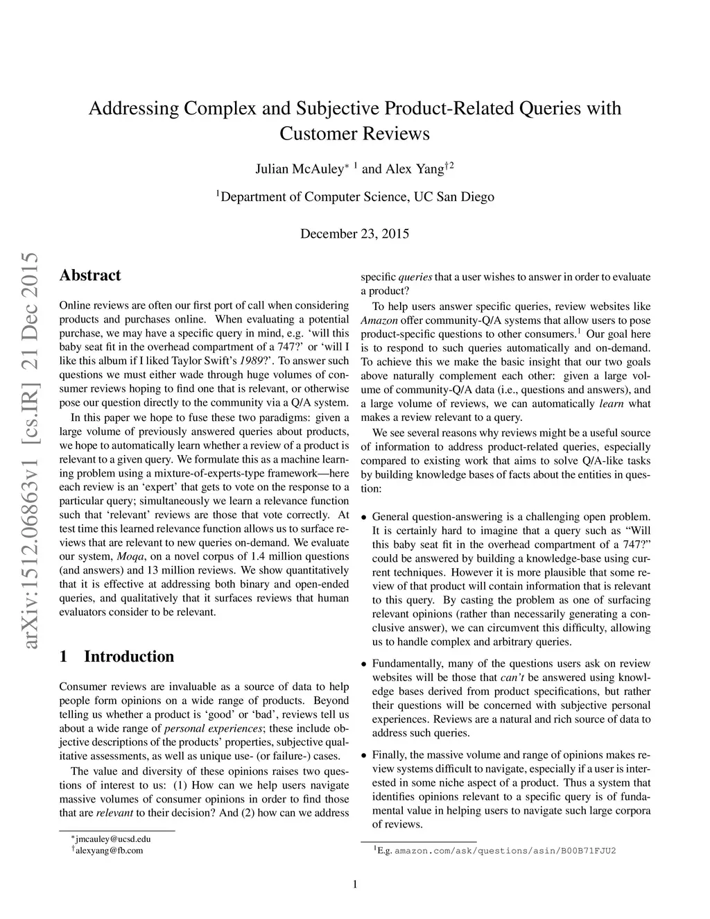 Online reviews are often our first port of call when considering products and purchases online. When evaluating a potential purchase, we may have a specific query in mind, e.g. `will this baby seat fit in the overhead compartment of a 747?' or `will I like this album if I liked Taylor Swift's 1989?'. To answer such questions we must either wade through huge volumes of consumer reviews hoping to find one that is relevant, or otherwise pose our question directly to the community via a Q/A system. In this paper we hope to fuse these two paradigms: given a large volume of previously answered queries about products, we hope to automatically learn whether a review of a product is relevant to a given query. We formulate this as a machine learning problem using a mixture-of-experts-type framework---here each review is an `expert' that gets to vote on the response to a particular query; simultaneously we learn a relevance function such that `relevant' reviews are those that vote correctly. At test time this learned relevance function allows us to surface reviews that are relevant to new queries on-demand. We evaluate our system, Moqa, on a novel corpus of 1.4 million questions (and answers) and 13 million reviews. We show quantitatively that it is effective at addressing both binary and open-ended queries, and qualitatively that it surfaces reviews that human evaluators consider to be relevant.