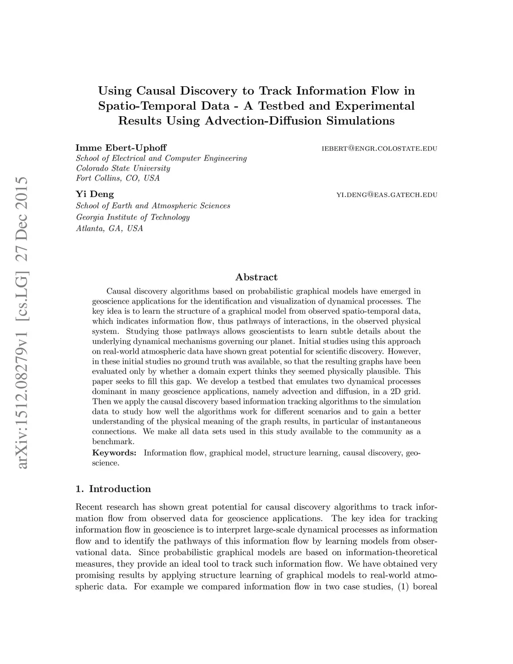 Causal discovery algorithms based on probabilistic graphical models have emerged in geoscience applications for the identification and visualization of dynamical processes. The key idea is to learn the structure of a graphical model from observed spatio-temporal data, which indicates information flow, thus pathways of interactions, in the observed physical system. Studying those pathways allows geoscientists to learn subtle details about the underlying dynamical mechanisms governing our planet. Initial studies using this approach on real-world atmospheric data have shown great potential for scientific discovery. However, in these initial studies no ground truth was available, so that the resulting graphs have been evaluated only by whether a domain expert thinks they seemed physically plausible. This paper seeks to fill this gap. We develop a testbed that emulates two dynamical processes dominant in many geoscience applications, namely advection and diffusion, in a 2D grid. Then we apply the causal discovery based information tracking algorithms to the simulation data to study how well the algorithms work for different scenarios and to gain a better understanding of the physical meaning of the graph results, in particular of instantaneous connections. We make all data sets used in this study available to the community as a benchmark. Keywords: Information flow, graphical model, structure learning, causal discovery, geoscience.