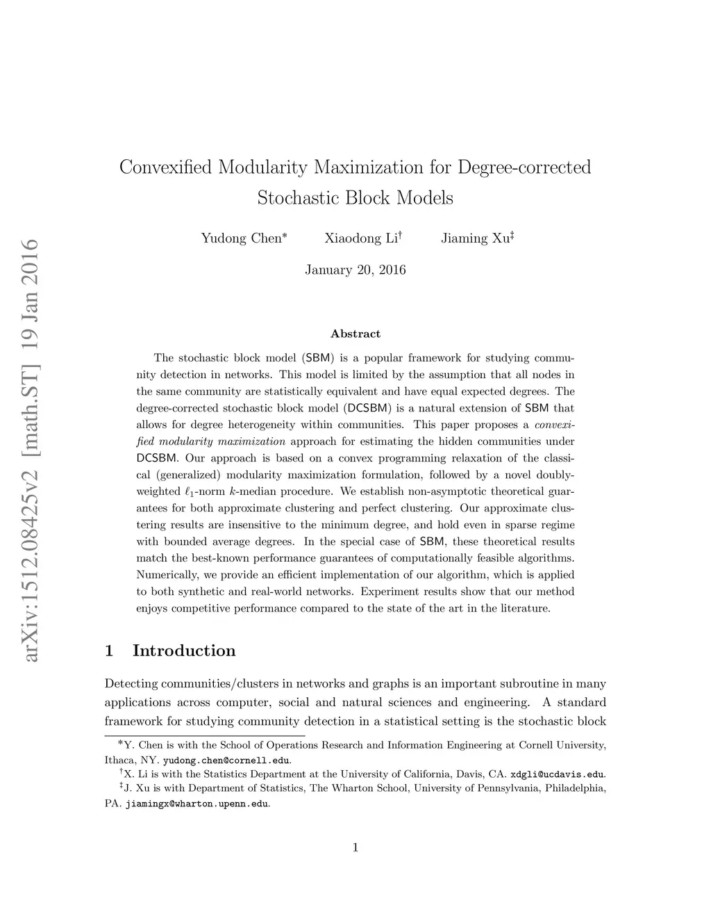 The stochastic block model (SBM) is a popular framework for studying community detection in networks. This model is limited by the assumption that all nodes in the same community are statistically equivalent and have equal expected degrees. The degree-corrected stochastic block model (DCSBM) is a natural extension of SBM that allows for degree heterogeneity within communities. This paper proposes a convexified modularity maximization approach for estimating the hidden communities under DCSBM. Our approach is based on a convex programming relaxation of the classical (generalized) modularity maximization formulation, followed by a novel doubly-weighted $ \ell_1 $-norm $ k $-median procedure. We establish non-asymptotic theoretical guarantees for both approximate clustering and perfect clustering. Our approximate clustering results are insensitive to the minimum degree, and hold even in sparse regime with bounded average degrees. In the special case of SBM, these theoretical results match the best-known performance guarantees of computationally feasible algorithms. Numerically, we provide an efficient implementation of our algorithm, which is applied to both synthetic and real-world networks. Experiment results show that our method enjoys competitive performance compared to the state of the art in the literature.