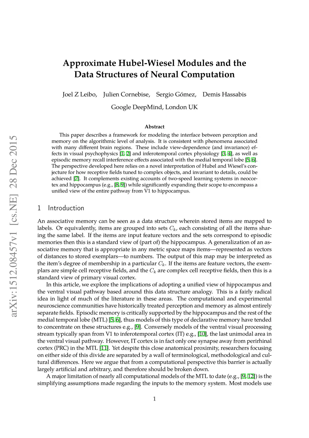 This paper describes a framework for modeling the interface between perception and memory on the algorithmic level of analysis. It is consistent with phenomena associated with many different brain regions. These include view-dependence (and invariance) effects in visual psychophysics and inferotemporal cortex physiology, as well as episodic memory recall interference effects associated with the medial temporal lobe. The perspective developed here relies on a novel interpretation of Hubel and Wiesel's conjecture for how receptive fields tuned to complex objects, and invariant to details, could be achieved. It complements existing accounts of two-speed learning systems in neocortex and hippocampus (e.g., McClelland et al. 1995) while significantly expanding their scope to encompass a unified view of the entire pathway from V1 to hippocampus.