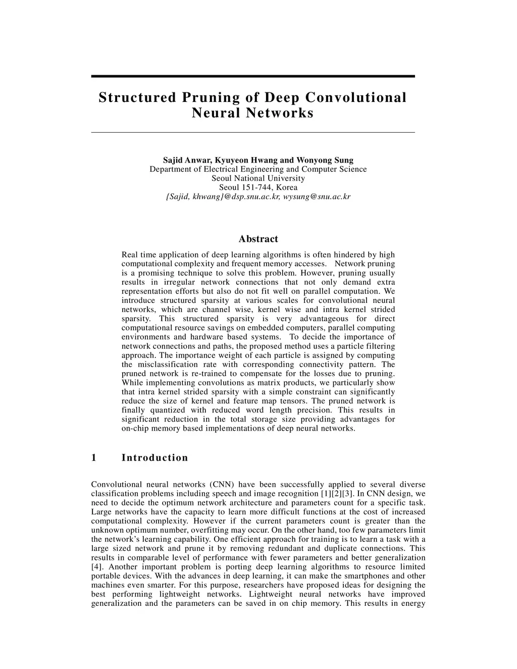 Real time application of deep learning algorithms is often hindered by high computational complexity and frequent memory accesses. Network pruning is a promising technique to solve this problem. However, pruning usually results in irregular network connections that not only demand extra representation efforts but also do not fit well on parallel computation. We introduce structured sparsity at various scales for convolutional neural networks, which are channel wise, kernel wise and intra kernel strided sparsity. This structured sparsity is very advantageous for direct computational resource savings on embedded computers, parallel computing environments and hardware based systems. To decide the importance of network connections and paths, the proposed method uses a particle filtering approach. The importance weight of each particle is assigned by computing the misclassification rate with corresponding connectivity pattern. The pruned network is re-trained to compensate for the losses due to pruning. While implementing convolutions as matrix products, we particularly show that intra kernel strided sparsity with a simple constraint can significantly reduce the size of kernel and feature map matrices. The pruned network is finally fixed point optimized with reduced word length precision. This results in significant reduction in the total storage size providing advantages for on-chip memory based implementations of deep neural networks.