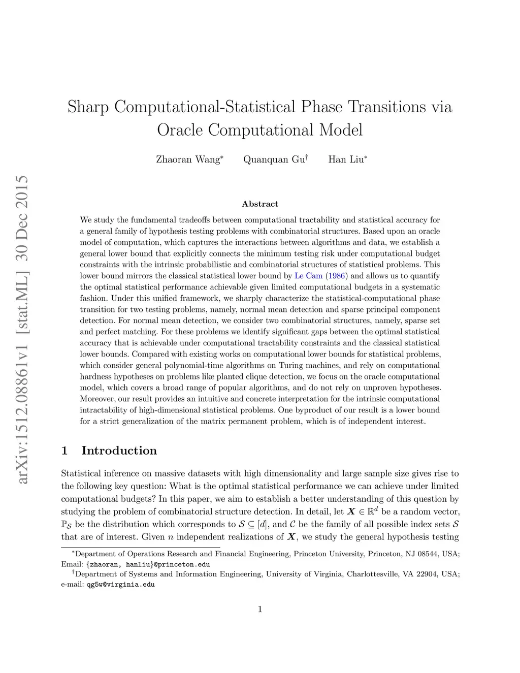 We study the fundamental tradeoffs between computational tractability and statistical accuracy for a general family of hypothesis testing problems with combinatorial structures. Based upon an oracle model of computation, which captures the interactions between algorithms and data, we establish a general lower bound that explicitly connects the minimum testing risk under computational budget constraints with the intrinsic probabilistic and combinatorial structures of statistical problems. This lower bound mirrors the classical statistical lower bound by Le Cam (1986) and allows us to quantify the optimal statistical performance achievable given limited computational budgets in a systematic fashion. Under this unified framework, we sharply characterize the statistical-computational phase transition for two testing problems, namely, normal mean detection and sparse principal component detection. For normal mean detection, we consider two combinatorial structures, namely, sparse set and perfect matching. For these problems we identify significant gaps between the optimal statistical accuracy that is achievable under computational tractability constraints and the classical statistical lower bounds. Compared with existing works on computational lower bounds for statistical problems, which consider general polynomial-time algorithms on Turing machines, and rely on computational hardness hypotheses on problems like planted clique detection, we focus on the oracle computational model, which covers a broad range of popular algorithms, and do not rely on unproven hypotheses. Moreover, our result provides an intuitive and concrete interpretation for the intrinsic computational intractability of high-dimensional statistical problems. One byproduct of our result is a lower bound for a strict generalization of the matrix permanent problem, which is of independent interest.
