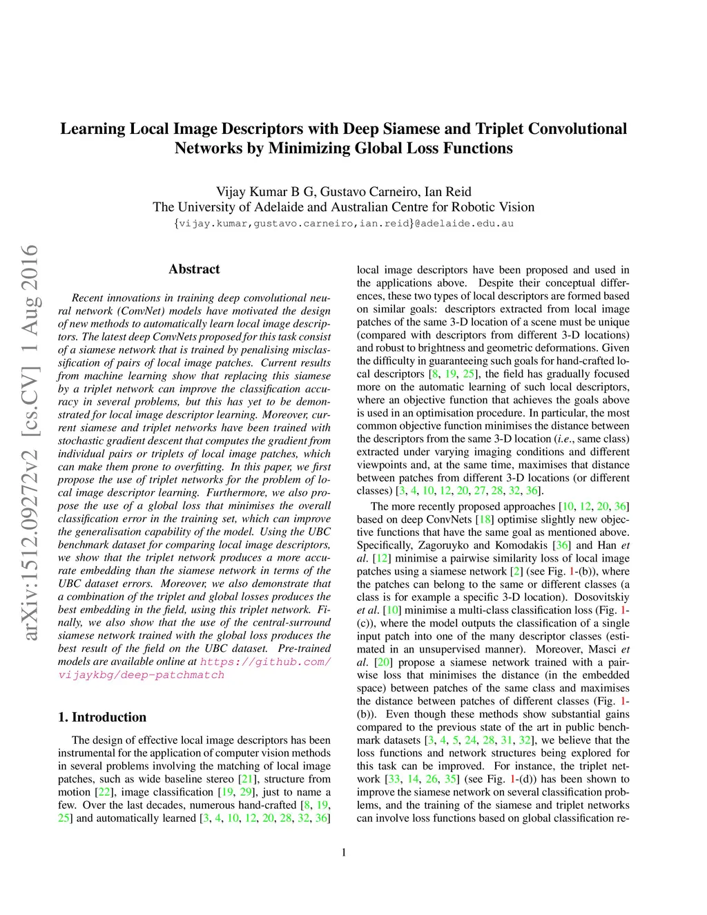 Recent innovations in training deep convolutional neural network (ConvNet) models have motivated the design of new methods to automatically learn local image descriptors. The latest deep ConvNets proposed for this task consist of a siamese network that is trained by penalising misclassification of pairs of local image patches. Current results from machine learning show that replacing this siamese by a triplet network can improve the classification accuracy in several problems, but this has yet to be demonstrated for local image descriptor learning. Moreover, current siamese and triplet networks have been trained with stochastic gradient descent that computes the gradient from individual pairs or triplets of local image patches, which can make them prone to overfitting. In this paper, we first propose the use of triplet networks for the problem of local image descriptor learning. Furthermore, we also propose the use of a global loss that minimises the overall classification error in the training set, which can improve the generalisation capability of the model. Using the UBC benchmark dataset for comparing local image descriptors, we show that the triplet network produces a more accurate embedding than the siamese network in terms of the UBC dataset errors. Moreover, we also demonstrate that a combination of the triplet and global losses produces the best embedding in the field, using this triplet network. Finally, we also show that the use of the central-surround siamese network trained with the global loss produces the best result of the field on the UBC dataset. Pre-trained models are available online at https://github.com/vijaykbg/deep-patchmatch
