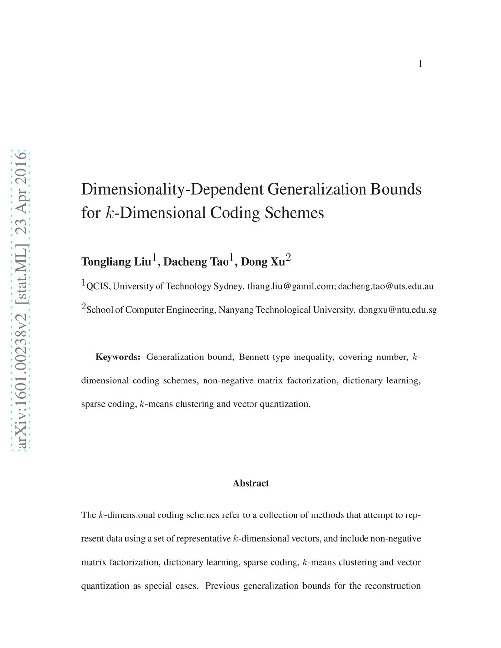 The -dimensional coding schemes refer to a collection of methods that attempt to represent data using a set of representative -dimensional vectors, and include non-negative matrix factorization, dictionary learning, sparse coding, -means clustering and vector quantization as special cases. Previous generalization bounds for the reconstruction error of the -dimensional coding schemes are mainly dimensionality independent. A major advantage of these bounds is that they can be used to analyze the generalization error when data is mapped into an infinite- or high-dimensional feature space. However, many applications use finite-dimensional data features. Can we obtain dimensionality-dependent generalization bounds for -dimensional coding schemes that are tighter than dimensionality-independent bounds when data is in a finite-dimensional feature space? The answer is positive. In this paper, we address this problem and derive a dimensionality-dependent generalization bound for -dimensional coding schemes by bounding the covering number of the loss function class induced by the reconstruction error. The bound is of order , where is the dimension of features, is the number of the columns in the linear implementation of coding schemes, is the size of sample, when is finite and when is infinite. We show that our bound can be tighter than previous results, because it avoids inducing the worst-case upper bound on of the loss function and converges faster. The proposed generalization bound is also applied to some specific coding schemes to demonstrate that the dimensionality-dependent bound is an indispensable complement to these dimensionality-independent generalization bounds.