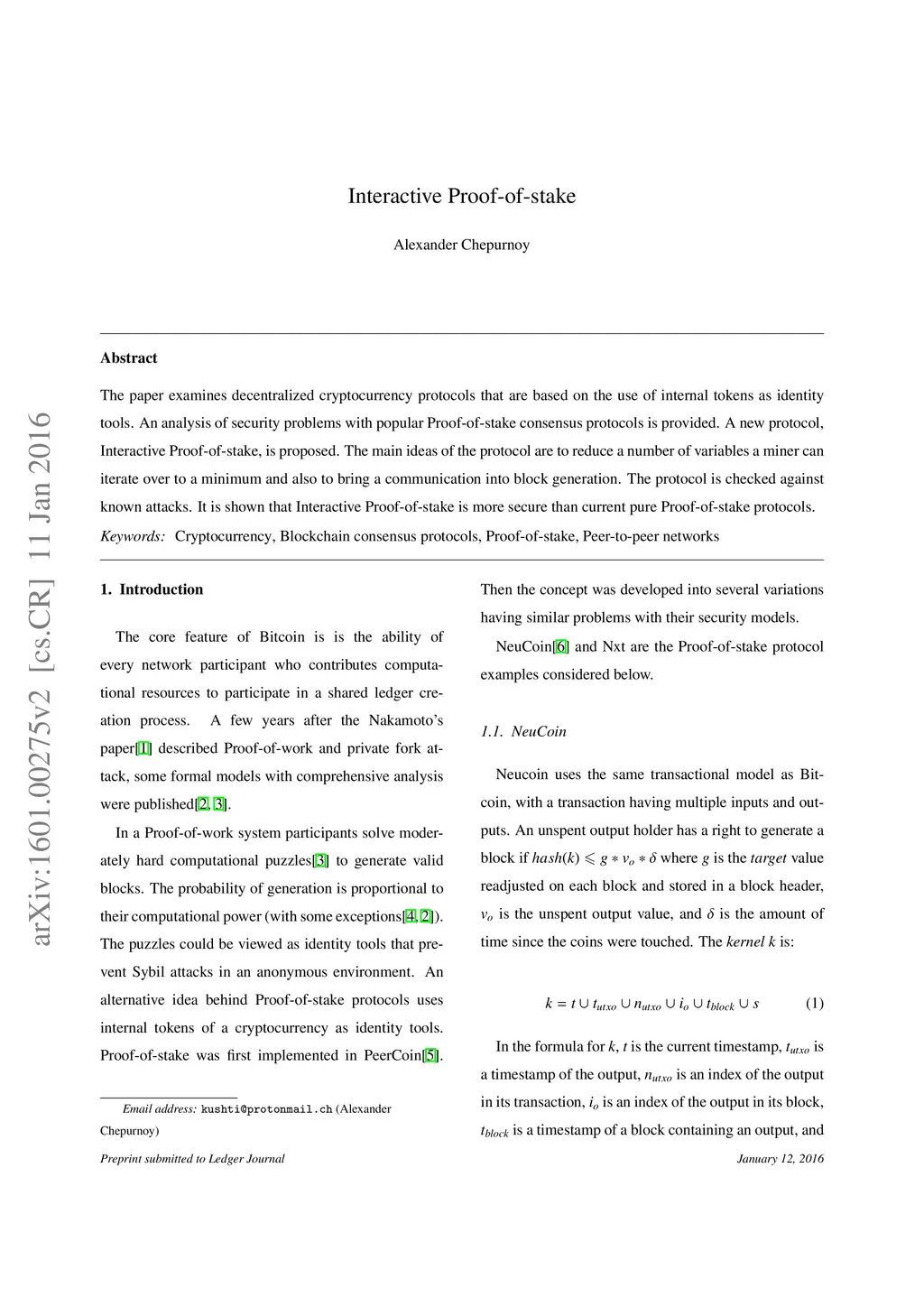 The paper examines decentralized cryptocurrency protocols that are based on the use of internal tokens as identity tools. An analysis of security problems with popular Proof-of-stake consensus protocols is provided. A new protocol, Interactive Proof-of-stake, is proposed. The main ideas of the protocol are to reduce a number of variables a miner can iterate over to a minimum and also to bring a communication into block generation. The protocol is checked against known attacks. It is shown that Interactive Proof-of-stake is more secure than current pure Proof-of-stake protocols.