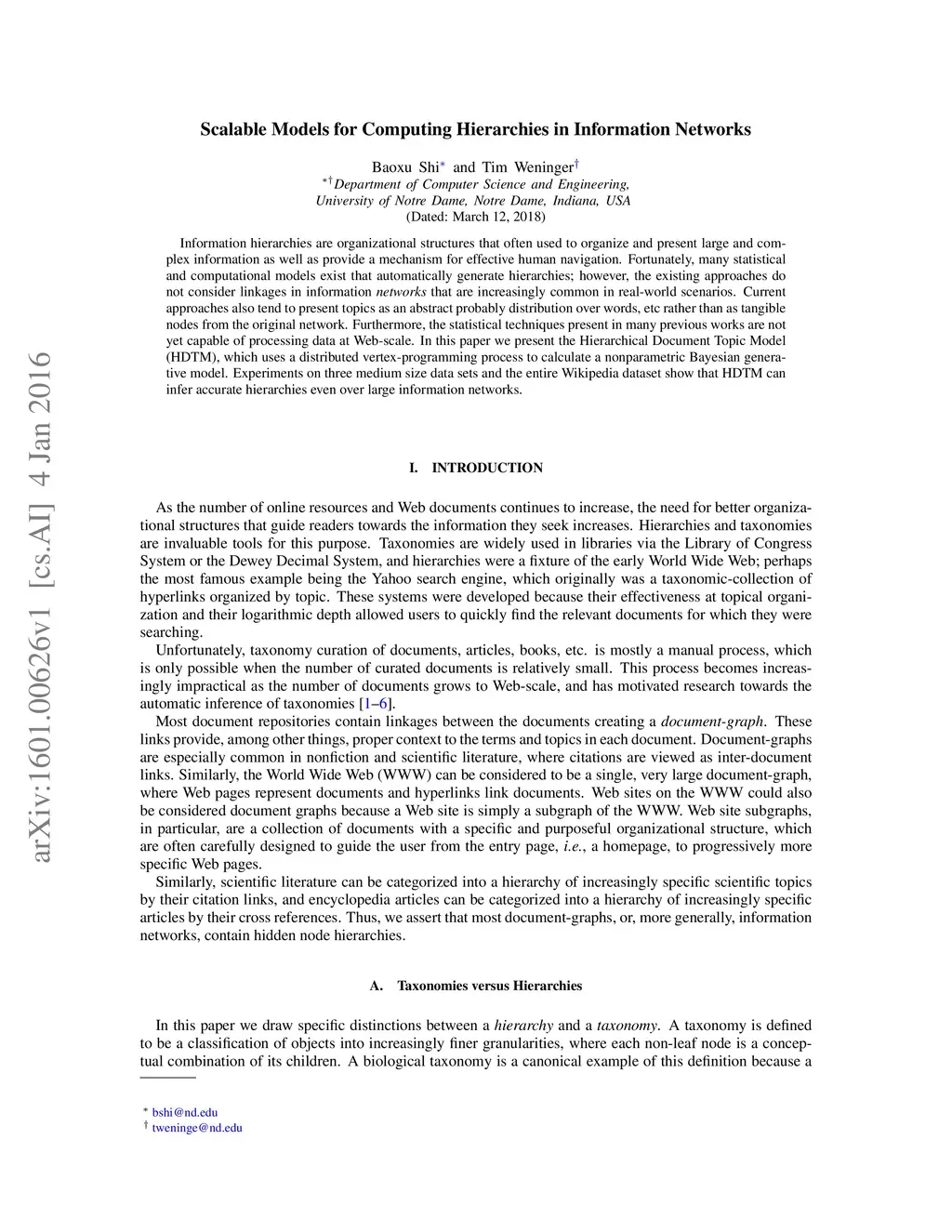 Information hierarchies are organizational structures that often used to organize and present large and complex information as well as provide a mechanism for effective human navigation. Fortunately, many statistical and computational models exist that automatically generate hierarchies; however, the existing approaches do not consider linkages in information {\em networks} that are increasingly common in real-world scenarios. Current approaches also tend to present topics as an abstract probably distribution over words, etc rather than as tangible nodes from the original network. Furthermore, the statistical techniques present in many previous works are not yet capable of processing data at Web-scale. In this paper we present the Hierarchical Document Topic Model (HDTM), which uses a distributed vertex-programming process to calculate a nonparametric Bayesian generative model. Experiments on three medium size data sets and the entire Wikipedia dataset show that HDTM can infer accurate hierarchies even over large information networks.