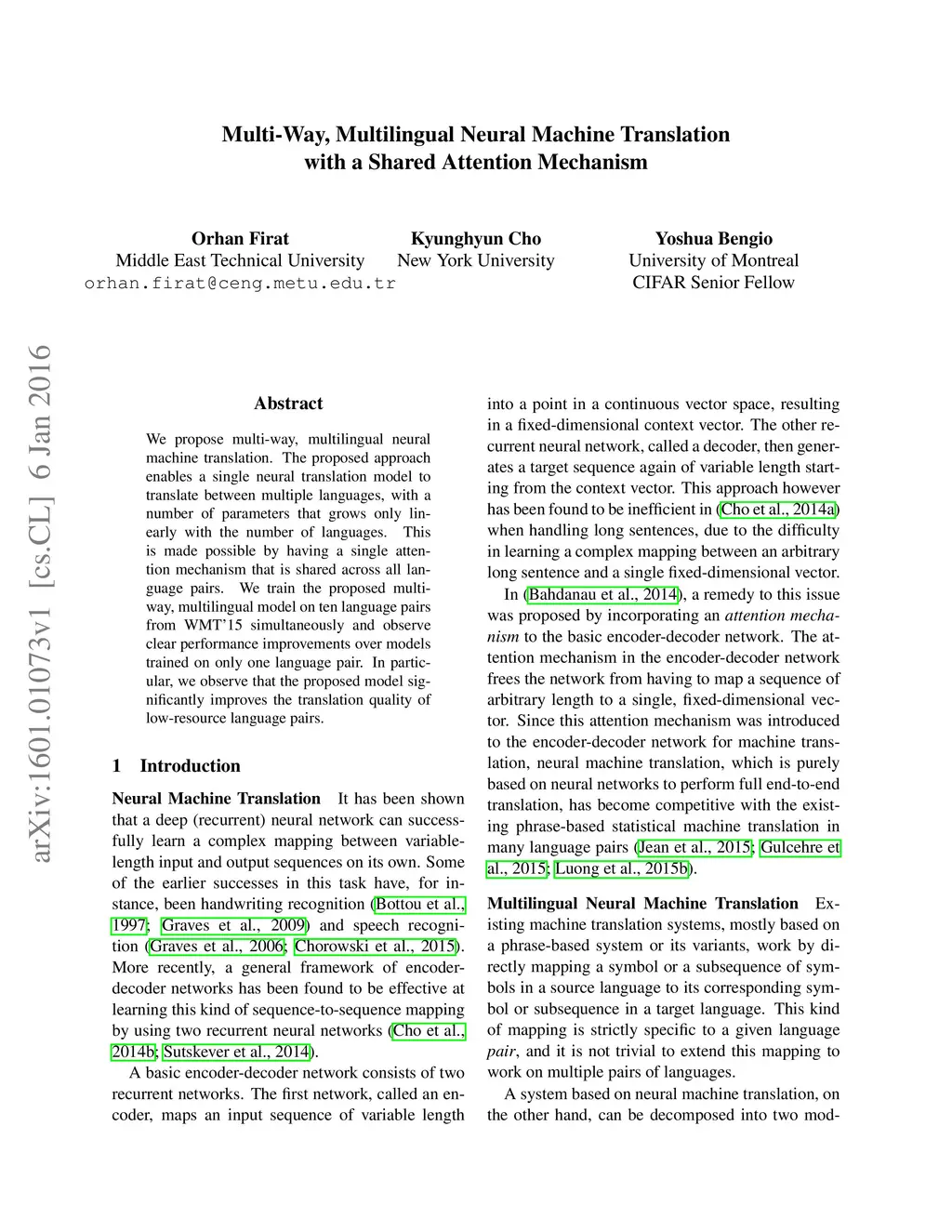 We propose multi-way, multilingual neural machine translation. The proposed approach enables a single neural translation model to translate between multiple languages, with a number of parameters that grows only linearly with the number of languages. This is made possible by having a single attention mechanism that is shared across all language pairs. We train the proposed multi-way, multilingual model on ten language pairs from WMT'15 simultaneously and observe clear performance improvements over models trained on only one language pair. In particular, we observe that the proposed model significantly improves the translation quality of low-resource language pairs.