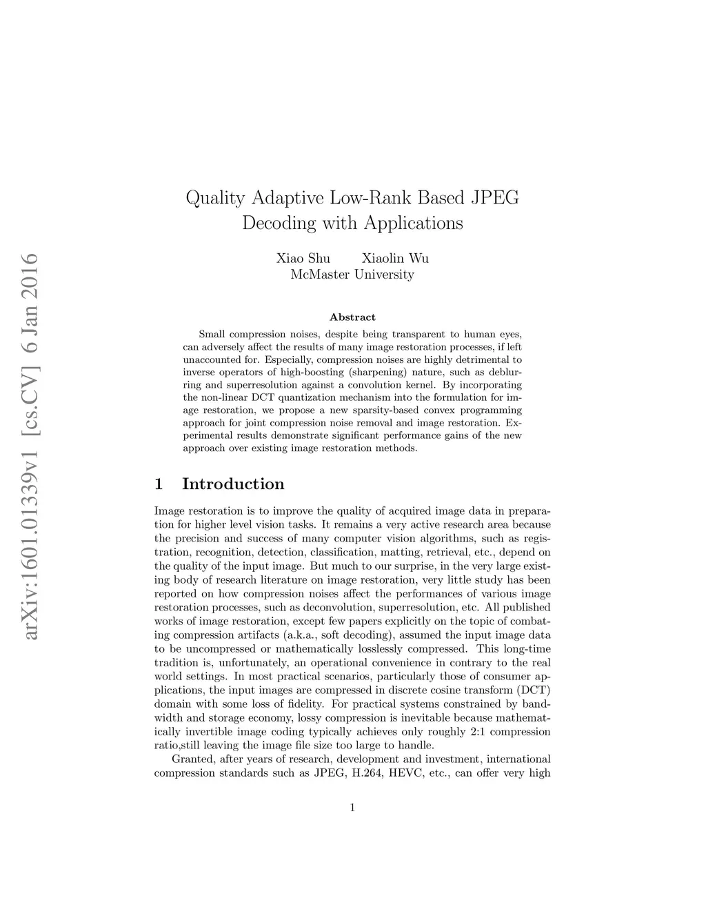 Quality Adaptive Low-Rank Based JPEG Decoding with Applications