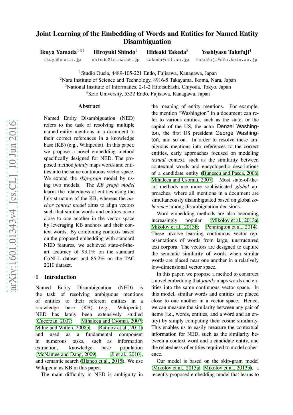 Joint Learning of the Embedding of Words and Entities for Named Entity