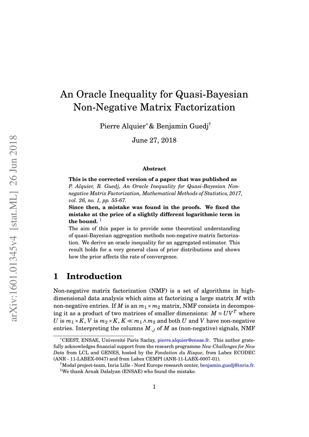 The aim of this paper is to provide some theoretical understanding of quasi-Bayesian aggregation methods non-negative matrix factorization. We derive an oracle inequality for an aggregated estimator. This result holds for a very general class of prior distributions and shows how the prior affects the rate of convergence.