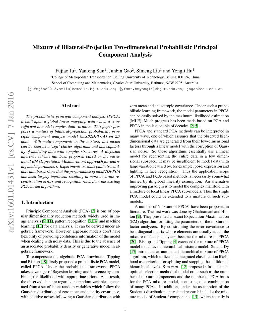 The probabilistic principal component analysis (PPCA) is built upon a global linear mapping, with which it is insufficient to model complex data variation. This paper proposes a mixture of bilateral-projection probabilistic principal component analysis model (mixB2DPPCA) on 2D data. With multi-components in the mixture, this model can be seen as a soft cluster algorithm and has capability of modeling data with complex structures. A Bayesian inference scheme has been proposed based on the variational EM (Expectation-Maximization) approach for learning model parameters. Experiments on some publicly available databases show that the performance of mixB2DPPCA has been largely improved, resulting in more accurate reconstruction errors and recognition rates than the existing PCA-based algorithms.
