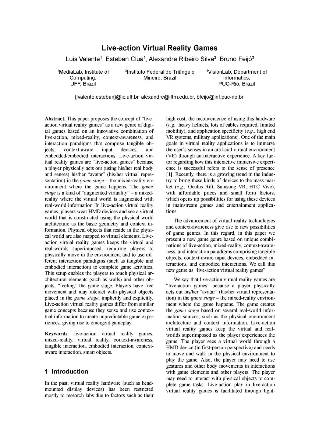 This paper proposes the concept of "live-action virtual reality games" as a new genre of digital games based on an innovative combination of live-action, mixed-reality, context-awareness, and interaction paradigms that comprise tangible objects, context-aware input devices, and embedded/embodied interactions. Live-action virtual reality games are "live-action games" because a player physically acts out (using his/her real body and senses) his/her "avatar" (his/her virtual representation) in the game stage, which is the mixed-reality environment where the game happens. The game stage is a kind of "augmented virtuality"; a mixed-reality where the virtual world is augmented with real-world information. In live-action virtual reality games, players wear HMD devices and see a virtual world that is constructed using the physical world architecture as the basic geometry and context information. Physical objects that reside in the physical world are also mapped to virtual elements. Live-action virtual reality games keeps the virtual and real-worlds superimposed, requiring players to physically move in the environment and to use different interaction paradigms (such as tangible and embodied interaction) to complete game activities. This setup enables the players to touch physical architectural elements (such as walls) and other objects, "feeling" the game stage. Players have free movement and may interact with physical objects placed in the game stage, implicitly and explicitly. Live-action virtual reality games differ from similar game concepts because they sense and use contextual information to create unpredictable game experiences, giving rise to emergent gameplay.