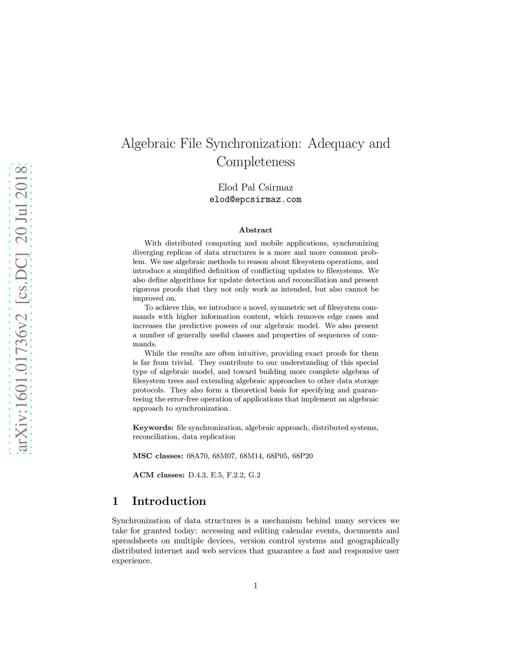 With distributed computing and mobile applications, synchronizing diverging replicas of data structures is a more and more common problem. We use algebraic methods to reason about filesystem operations, and introduce a simplified definition of conflicting updates to filesystems. We also define algorithms for update detection and reconciliation and present rigorous proofs that they not only work as intended, but also cannot be improved on. To achieve this, we introduce a novel, symmetric set of filesystem commands with higher information content, which removes edge cases and increases the predictive powers of our algebraic model. We also present a number of generally useful classes and properties of sequences of commands. While these results are often intuitive, providing exact proofs for them is far from trivial. They contribute to our understanding of this special type of algebraic model, and toward building more complete algebras of filesystem trees and extending algebraic approaches to other data storage protocols. They also form a theoretical basis for specifying and guaranteeing the error-free operation of applications that implement an algebraic approach to synchronization.