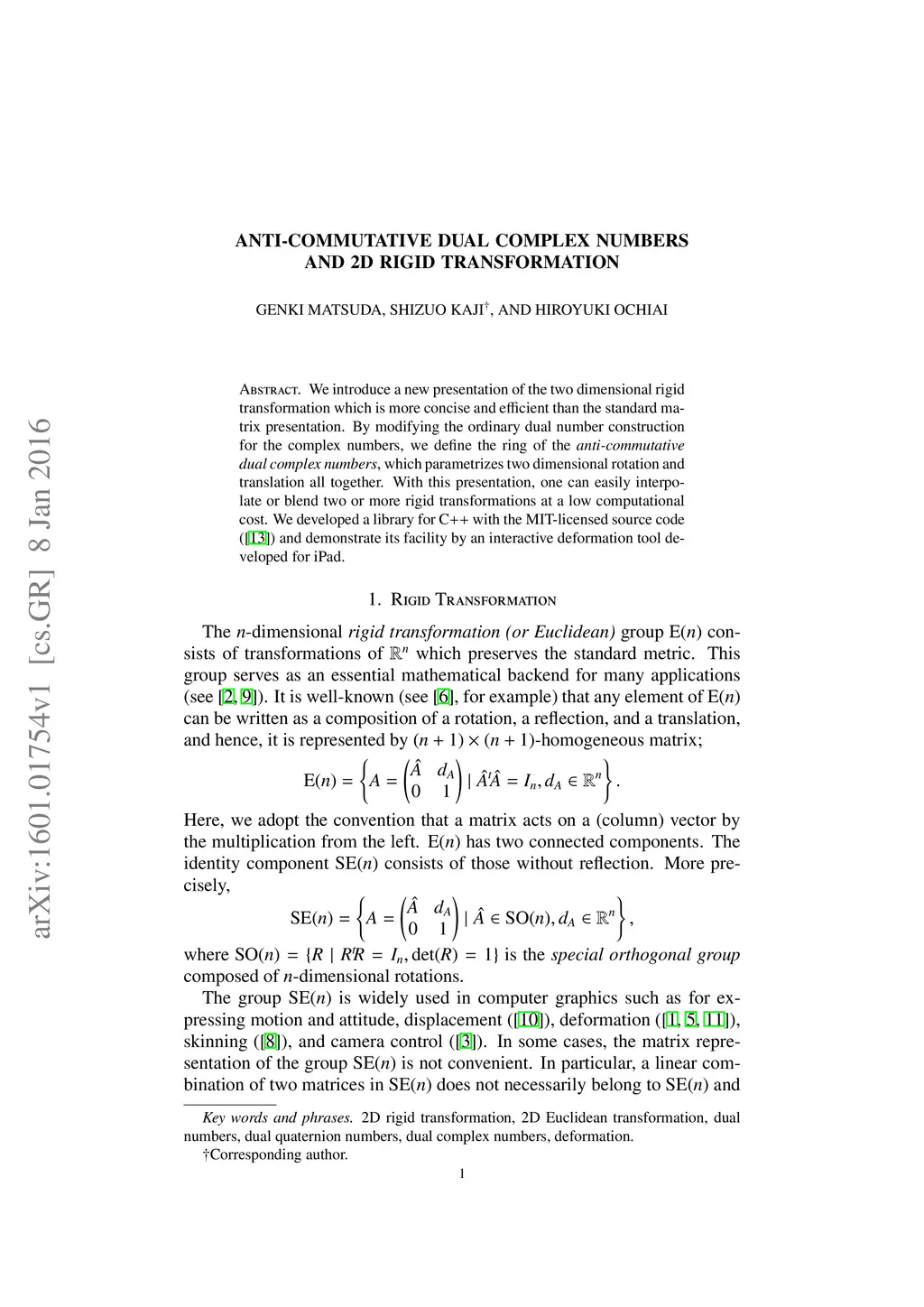 We introduce a new presentation of the two dimensional rigid transformation which is more concise and efficient than the standard matrix presentation. By modifying the ordinary dual number construction for the complex numbers, we define the ring of the anti-commutative dual complex numbers, which parametrizes two dimensional rotation and translation all together. With this presentation, one can easily interpolate or blend two or more rigid transformations at a low computational cost. We developed a library for C++ with the MIT-licensed source code and demonstrate its facility by an interactive deformation tool developed for iPad.