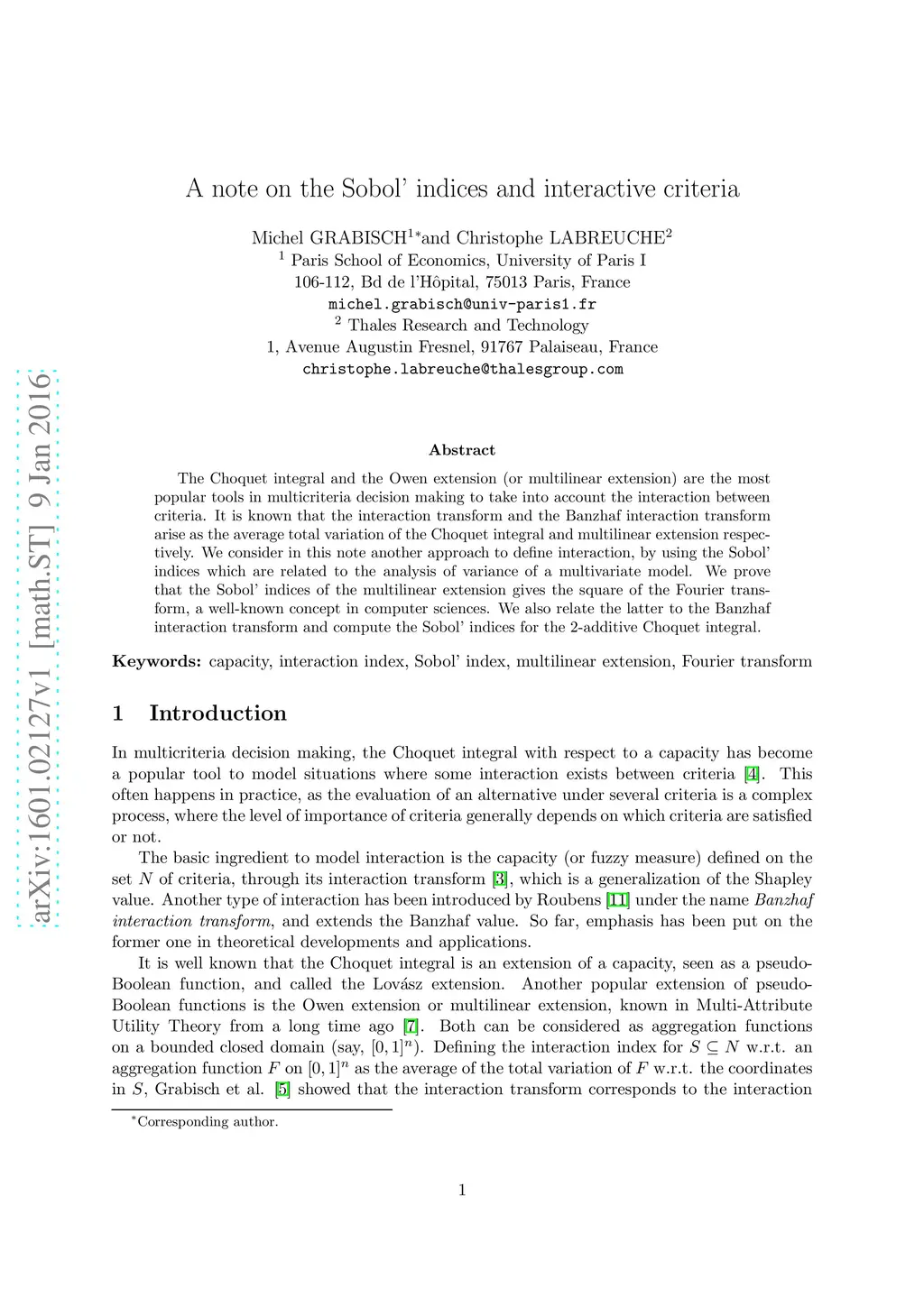The Choquet integral and the Owen extension (or multilinear extension) are the most popular tools in multicriteria decision making to take into account the interaction between criteria. It is known that the interaction transform and the Banzhaf interaction transform arise as the average total variation of the Choquet integral and multilinear extension respectively. We consider in this note another approach to define interaction, by using the Sobol' indices which are related to the analysis of variance of a multivariate model. We prove that the Sobol' indices of the multilinear extension gives the square of the Fourier transform, a well-known concept in computer sciences. We also relate the latter to the Banzhaf interaction transform and compute the Sobol' indices for the 2-additive Choquet integral.
