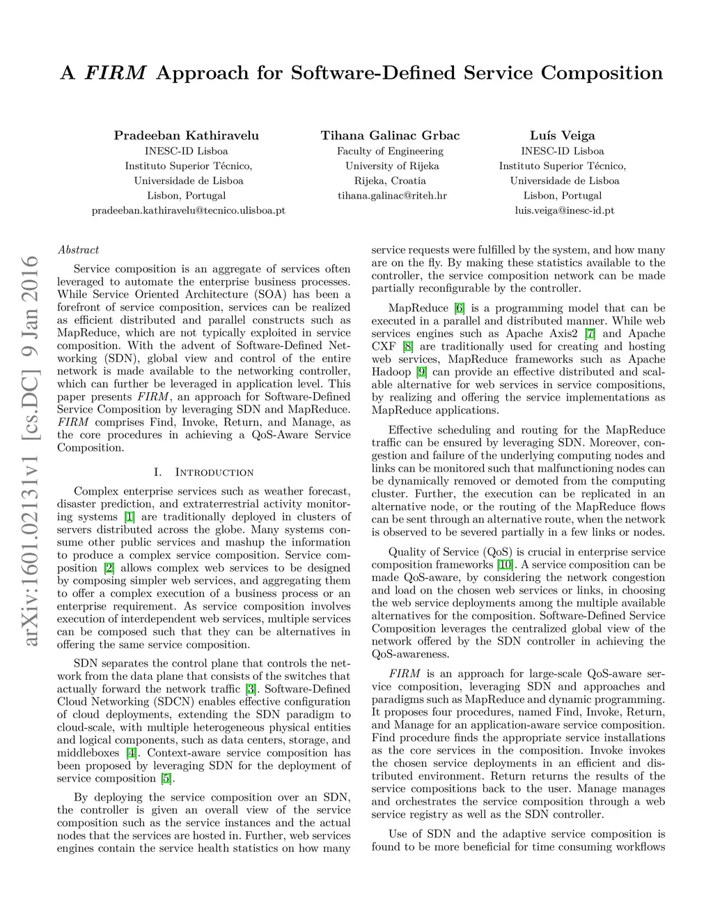 Service composition is an aggregate of services often leveraged to automate the enterprise business processes. While Service Oriented Architecture (SOA) has been a forefront of service composition, services can be realized as efficient distributed and parallel constructs such as MapReduce, which are not typically exploited in service composition. With the advent of Software\-Defined Networking (SDN), global view and control of the entire network is made available to the networking controller, which can further be leveraged in application level. This paper presents FIRM, an approach for Software-Defined Service Composition by leveraging SDN and MapReduce. FIRM comprises Find, Invoke, Return, and Manage, as the core procedures in achieving a QoS-Aware Service Composition.