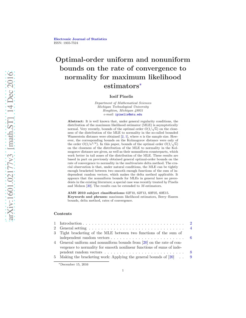 It is well known that under general regularity conditions the distribution of the maximum likelihood estimator (MLE) is asymptotically normal. Very recently, bounds of the optimal order on the closeness of the distribution of the MLE to normality in the so-called bounded Wasserstein distance were obtained, where is the sample size. However, the corresponding bounds on the Kolmogorov distance were only of the order . In this note, bounds of the optimal order on the closeness of the distribution of the MLE to normality in the Kolmogorov distance are given, as well as their nonuniform counterparts, which work better for large deviations of the MLE. These results are based on previously obtained general optimal-order bounds on the rate of convergence to normality in the multivariate delta method. The crucial observation is that, under natural conditions, the MLE can be tightly enough bracketed between two smooth enough functions of the sum of independent random vectors, which makes the delta method applicable.