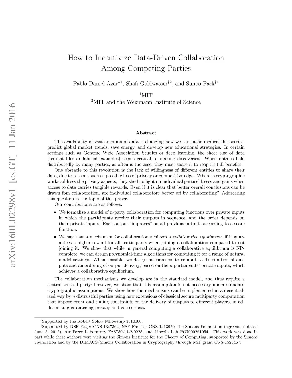 The availability of vast amounts of data is changing how we can make medical discoveries, predict global market trends, save energy, and develop educational strategies. In some settings such as Genome Wide Association Studies or deep learning, sheer size of data seems critical. When data is held distributedly by many parties, they must share it to reap its full benefits. One obstacle to this revolution is the lack of willingness of different parties to share data, due to reasons such as loss of privacy or competitive edge. Cryptographic works address privacy aspects, but shed no light on individual parties' losses/gains when access to data carries tangible rewards. Even if it is clear that better overall conclusions can be drawn from collaboration, are individual collaborators better off by collaborating? Addressing this question is the topic of this paper. * We formalize a model of n-party collaboration for computing functions over private inputs in which participants receive their outputs in sequence, and the order depends on their private inputs. Each output "improves" on preceding outputs according to a score function. * We say a mechanism for collaboration achieves collaborative equilibrium if it ensures higher reward for all participants when collaborating (rather than working alone). We show that in general, computing a collaborative equilibrium is NP-complete, yet we design efficient algorithms to compute it in a range of natural model settings. Our collaboration mechanisms are in the standard model, and thus require a central trusted party; however, we show this assumption is unnecessary under standard cryptographic assumptions. We show how to implement the mechanisms in a decentralized way with new extensions of secure multiparty computation that impose order/timing constraints on output delivery to different players, as well as privacy and correctness.