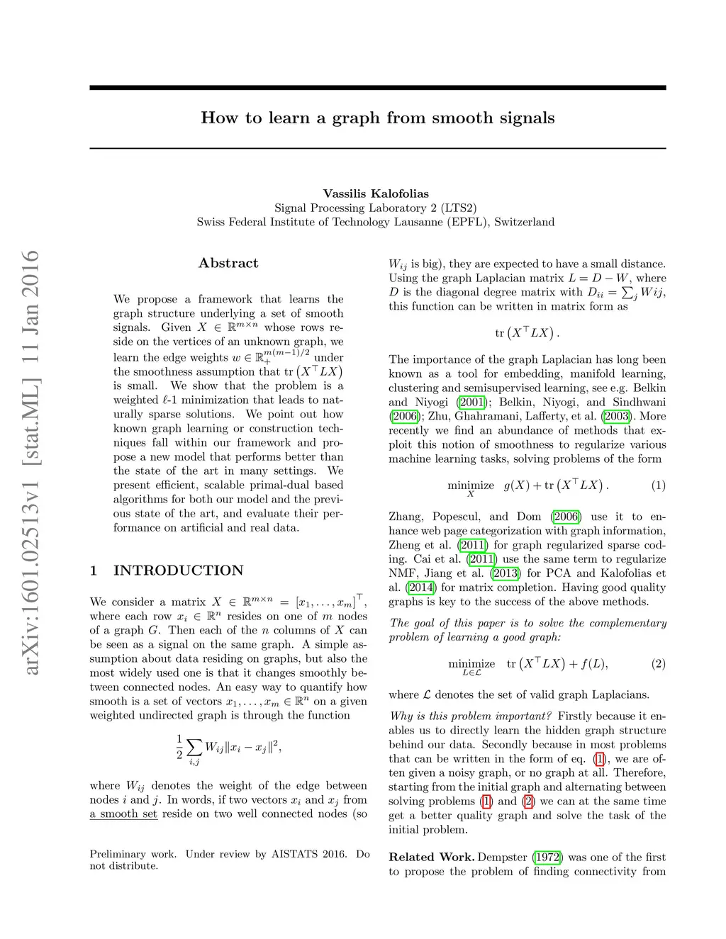 We propose a framework that learns the graph structure underlying a set of smooth signals. Given whose rows reside on the vertices of an unknown graph, we learn the edge weights under the smoothness assumption that is small. We show that the problem is a weighted -1 minimization that leads to naturally sparse solutions. We point out how known graph learning or construction techniques fall within our framework and propose a new model that performs better than the state of the art in many settings. We present efficient, scalable primal-dual based algorithms for both our model and the previous state of the art, and evaluate their performance on artificial and real data.