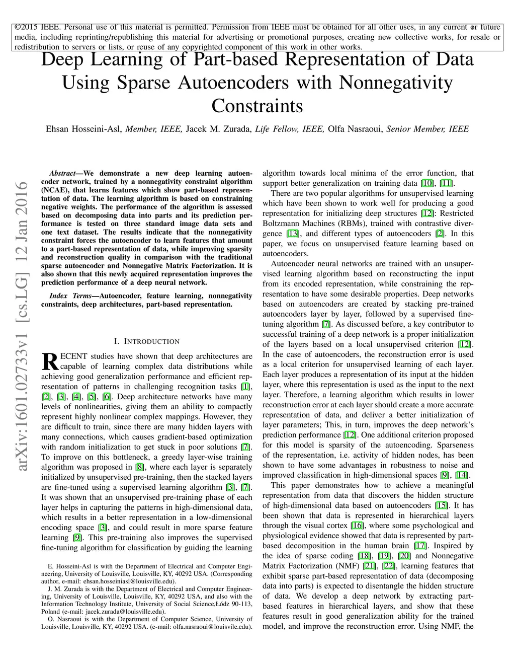 We demonstrate a new deep learning autoencoder network, trained by a nonnegativity constraint algorithm (NCAE), that learns features which show part-based representation of data. The learning algorithm is based on constraining negative weights. The performance of the algorithm is assessed based on decomposing data into parts and its prediction performance is tested on three standard image data sets and one text dataset. The results indicate that the nonnegativity constraint forces the autoencoder to learn features that amount to a part-based representation of data, while improving sparsity and reconstruction quality in comparison with the traditional sparse autoencoder and Nonnegative Matrix Factorization. It is also shown that this newly acquired representation improves the prediction performance of a deep neural network.