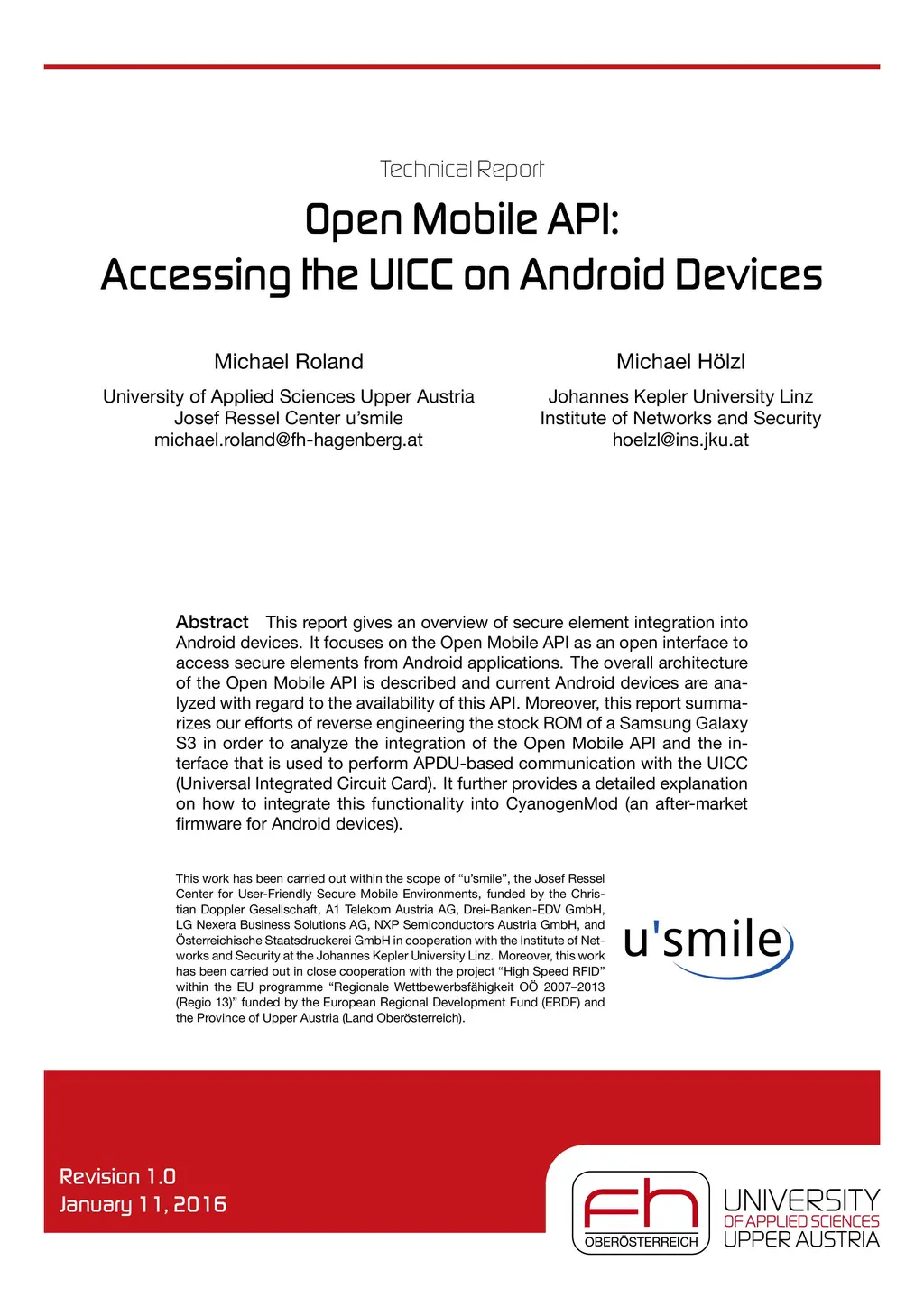 This report gives an overview of secure element integration into Android devices. It focuses on the Open Mobile API as an open interface to access secure elements from Android applications. The overall architecture of the Open Mobile API is described and current Android devices are analyzed with regard to the availability of this API. Moreover, this report summarizes our efforts of reverse engineering the stock ROM of a Samsung Galaxy S3 in order to analyze the integration of the Open Mobile API and the interface that is used to perform APDU-based communication with the UICC (Universal Integrated Circuit Card). It further provides a detailed explanation on how to integrate this functionality into CyanogenMod (an after-market firmware for Android devices).