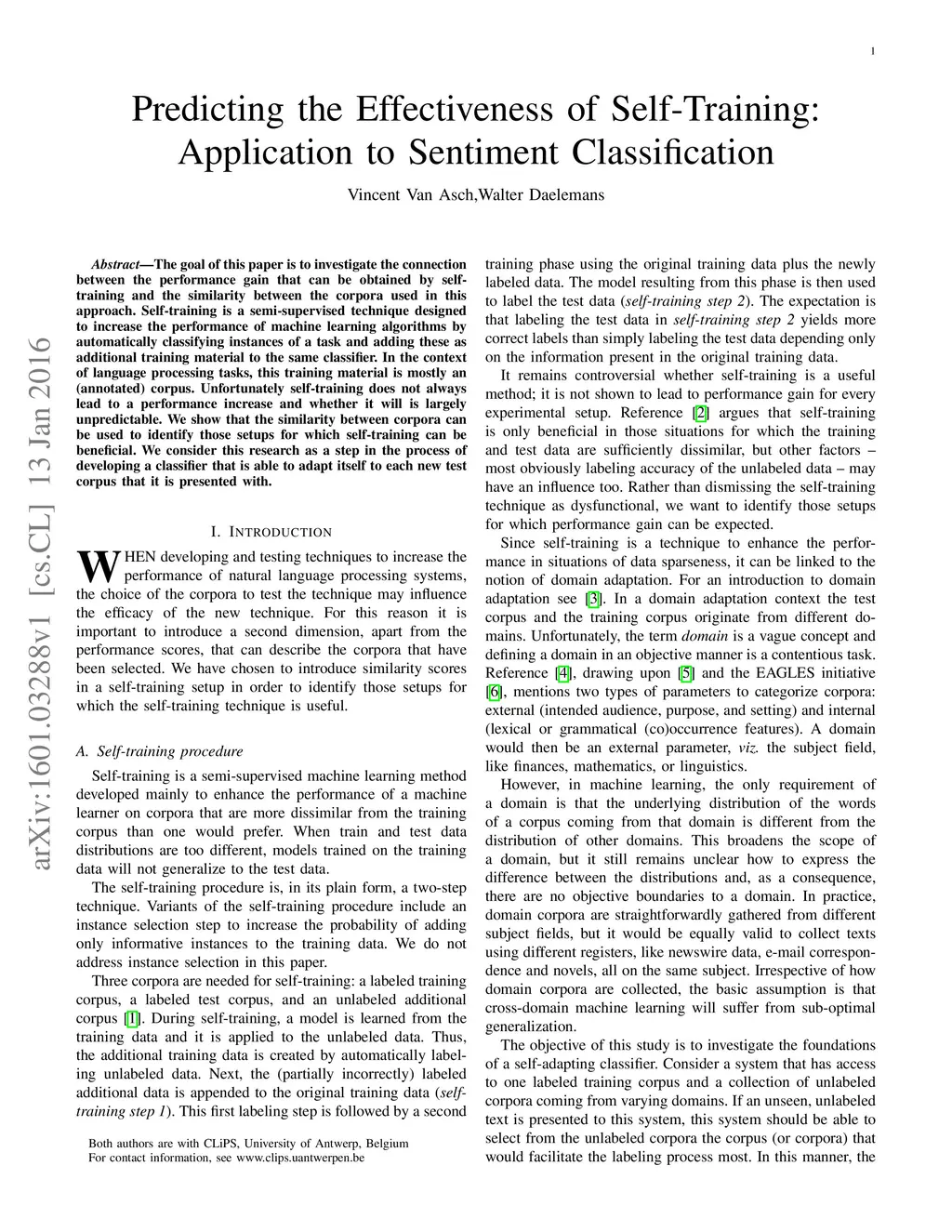 The goal of this paper is to investigate the connection between the performance gain that can be obtained by selftraining and the similarity between the corpora used in this approach. Self-training is a semi-supervised technique designed to increase the performance of machine learning algorithms by automatically classifying instances of a task and adding these as additional training material to the same classifier. In the context of language processing tasks, this training material is mostly an (annotated) corpus. Unfortunately self-training does not always lead to a performance increase and whether it will is largely unpredictable. We show that the similarity between corpora can be used to identify those setups for which self-training can be beneficial. We consider this research as a step in the process of developing a classifier that is able to adapt itself to each new test corpus that it is presented with.