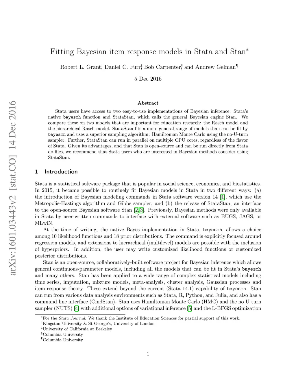 Fitting Bayesian item response models in Stata and Stan