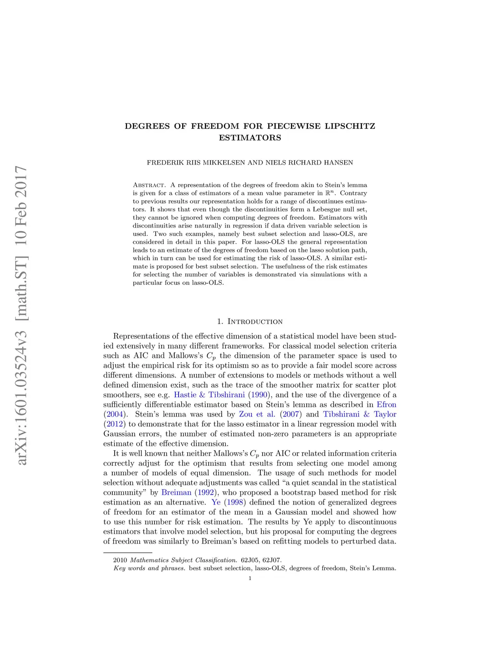 A representation of the degrees of freedom akin to Stein's lemma is given for a class of estimators of a mean value parameter in . Contrary to previous results our representation holds for a range of discontinues estimators. It shows that even though the discontinuities form a Lebesgue null set, they cannot be ignored when computing degrees of freedom. Estimators with discontinuities arise naturally in regression if data driven variable selection is used. Two such examples, namely best subset selection and lasso-OLS, are considered in detail in this paper. For lasso-OLS the general representation leads to an estimate of the degrees of freedom based on the lasso solution path, which in turn can be used for estimating the risk of lasso-OLS. A similar estimate is proposed for best subset selection. The usefulness of the risk estimates for selecting the number of variables is demonstrated via simulations with a particular focus on lasso-OLS.
