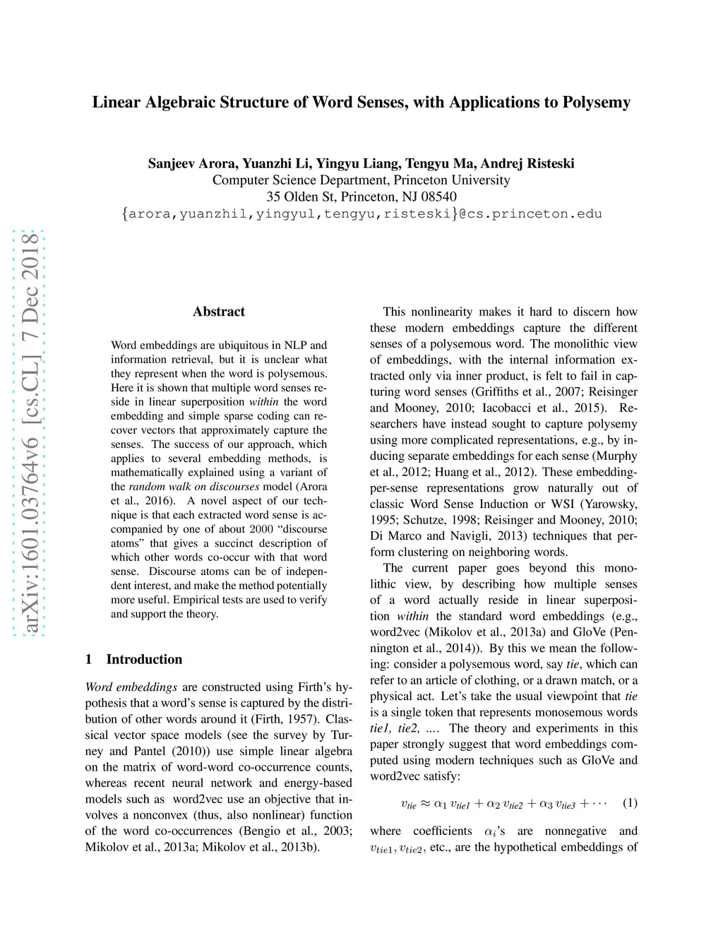 Word embeddings are ubiquitous in NLP and information retrieval, but it is unclear what they represent when the word is polysemous. Here it is shown that multiple word senses reside in linear superposition within the word embedding and simple sparse coding can recover vectors that approximately capture the senses. The success of our approach, which applies to several embedding methods, is mathematically explained using a variant of the random walk on discourses model (Arora et al., 2016). A novel aspect of our technique is that each extracted word sense is accompanied by one of about 2000 "discourse atoms" that gives a succinct description of which other words co-occur with that word sense. Discourse atoms can be of independent interest, and make the method potentially more useful. Empirical tests are used to verify and support the theory.