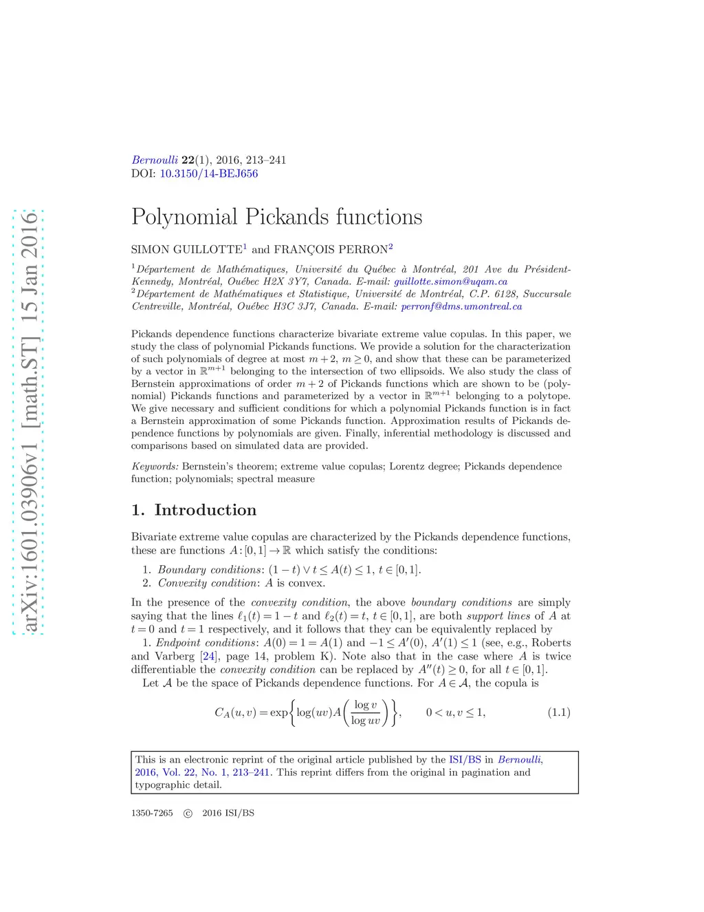 Pickands dependence functions characterize bivariate extreme value copulas. In this paper, we study the class of polynomial Pickands functions. We provide a solution for the characterization of such polynomials of degree at most , , and show that these can be parameterized by a vector in belonging to the intersection of two ellipsoids. We also study the class of Bernstein approximations of order of Pickands functions which are shown to be (polynomial) Pickands functions and parameterized by a vector in belonging to a polytope. We give necessary and sufficient conditions for which a polynomial Pickands function is in fact a Bernstein approximation of some Pickands function. Approximation results of Pickands dependence functions by polynomials are given. Finally, inferential methodology is discussed and comparisons based on simulated data are provided.
