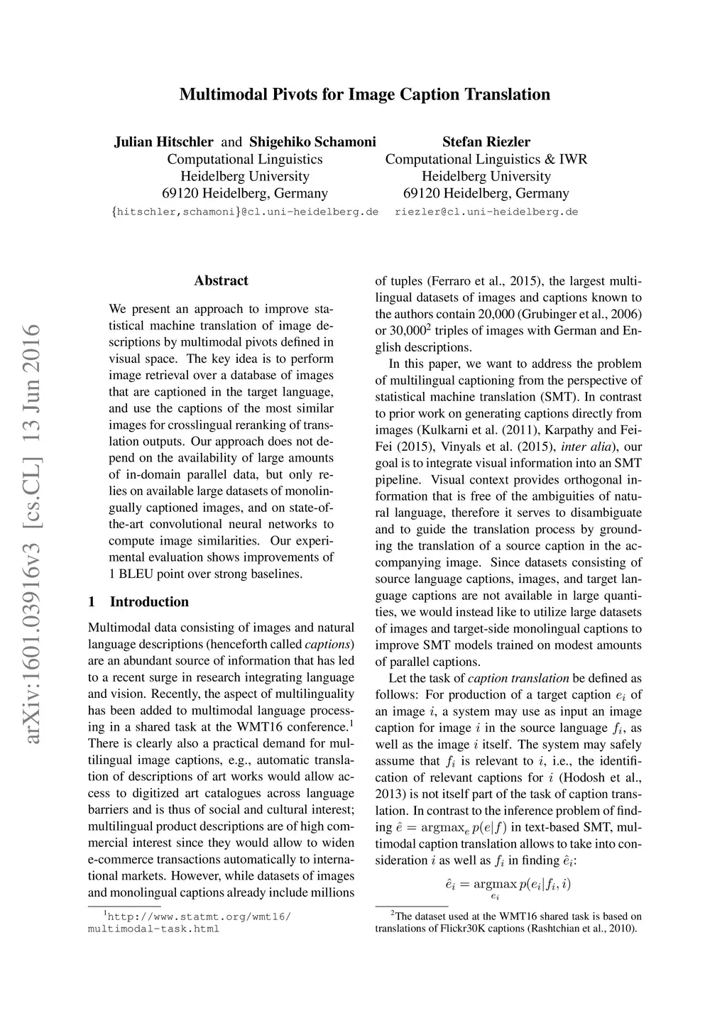 We present an approach to improve statistical machine translation of image descriptions by multimodal pivots defined in visual space. The key idea is to perform image retrieval over a database of images that are captioned in the target language, and use the captions of the most similar images for crosslingual reranking of translation outputs. Our approach does not depend on the availability of large amounts of in-domain parallel data, but only relies on available large datasets of monolingually captioned images, and on state-of-the-art convolutional neural networks to compute image similarities. Our experimental evaluation shows improvements of 1 BLEU point over strong baselines.