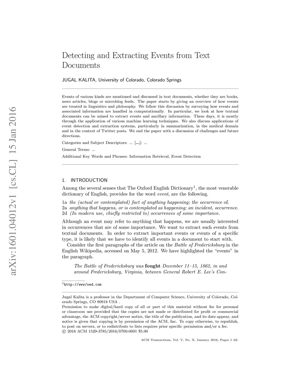 Events of various kinds are mentioned and discussed in text documents, whether they are books, news articles, blogs or microblog feeds. The paper starts by giving an overview of how events are treated in linguistics and philosophy. We follow this discussion by surveying how events and associated information are handled in computationally. In particular, we look at how textual documents can be mined to extract events and ancillary information. These days, it is mostly through the application of various machine learning techniques. We also discuss applications of event detection and extraction systems, particularly in summarization, in the medical domain and in the context of Twitter posts. We end the paper with a discussion of challenges and future directions.