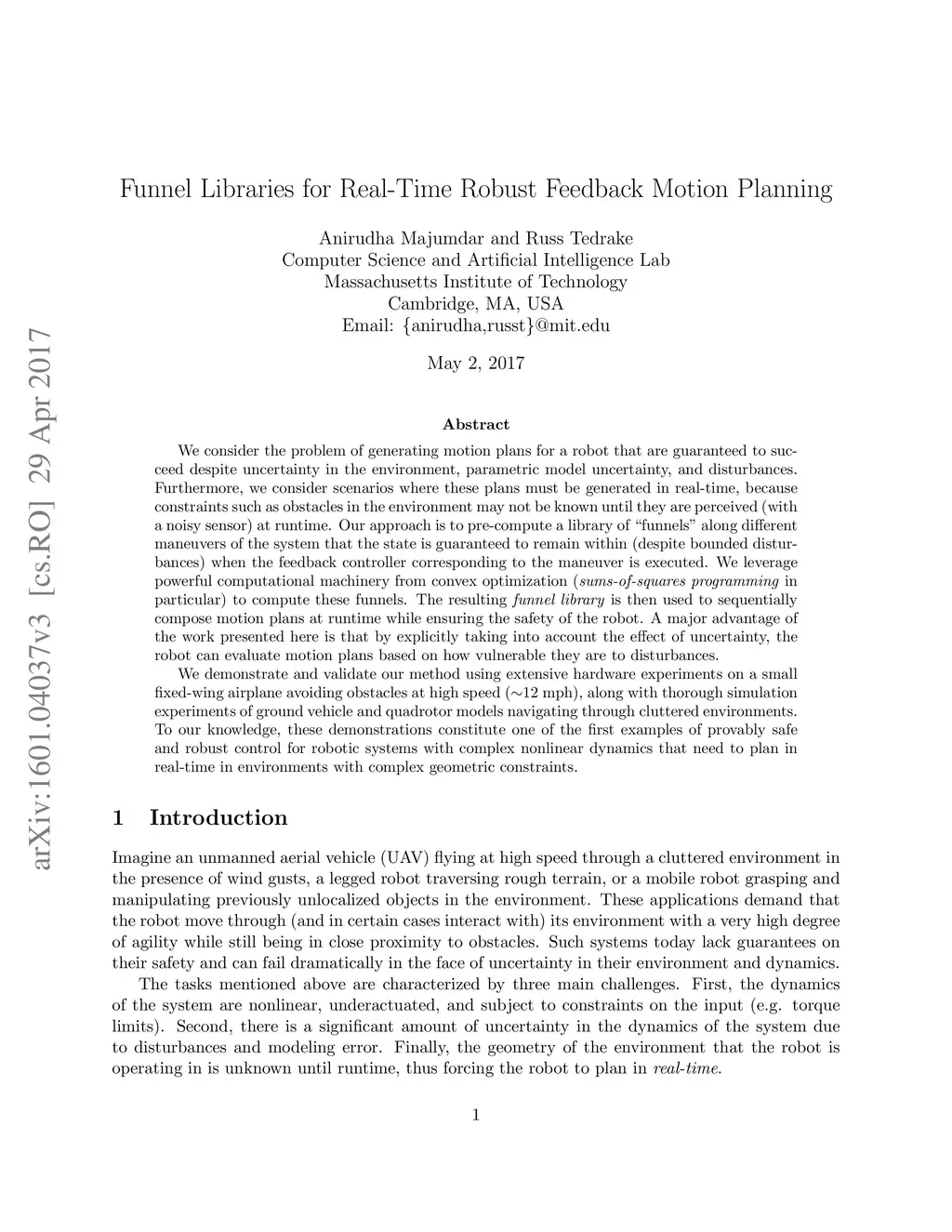 We consider the problem of generating motion plans for a robot that are guaranteed to succeed despite uncertainty in the environment, parametric model uncertainty, and disturbances. Furthermore, we consider scenarios where these plans must be generated in real-time, because constraints such as obstacles in the environment may not be known until they are perceived (with a noisy sensor) at runtime. Our approach is to pre-compute a library of "funnels" along different maneuvers of the system that the state is guaranteed to remain within (despite bounded disturbances) when the feedback controller corresponding to the maneuver is executed. We leverage powerful computational machinery from convex optimization (sums-of-squares programming in particular) to compute these funnels. The resulting funnel library is then used to sequentially compose motion plans at runtime while ensuring the safety of the robot. A major advantage of the work presented here is that by explicitly taking into account the effect of uncertainty, the robot can evaluate motion plans based on how vulnerable they are to disturbances. We demonstrate and validate our method using extensive hardware experiments on a small fixed-wing airplane avoiding obstacles at high speed (~12 mph), along with thorough simulation experiments of ground vehicle and quadrotor models navigating through cluttered environments. To our knowledge, the resulting hardware demonstrations on a fixed-wing airplane constitute one of the first examples of provably safe and robust control for robotic systems with complex nonlinear dynamics that need to plan in realtime in environments with complex geometric constraints.