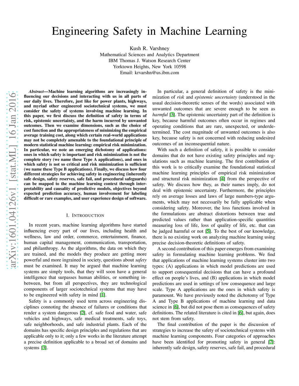 Machine learning algorithms are increasingly influencing our decisions and interacting with us in all parts of our daily lives. Therefore, just like for power plants, highways, and myriad other engineered sociotechnical systems, we must consider the safety of systems involving machine learning. In this paper, we first discuss the definition of safety in terms of risk, epistemic uncertainty, and the harm incurred by unwanted outcomes. Then we examine dimensions, such as the choice of cost function and the appropriateness of minimizing the empirical average training cost, along which certain real-world applications may not be completely amenable to the foundational principle of modern statistical machine learning: empirical risk minimization. In particular, we note an emerging dichotomy of applications: ones in which safety is important and risk minimization is not the complete story (we name these Type A applications), and ones in which safety is not so critical and risk minimization is sufficient (we name these Type B applications). Finally, we discuss how four different strategies for achieving safety in engineering (inherently safe design, safety reserves, safe fail, and procedural safeguards) can be mapped to the machine learning context through interpretability and causality of predictive models, objectives beyond expected prediction accuracy, human involvement for labeling difficult or rare examples, and user experience design of software.