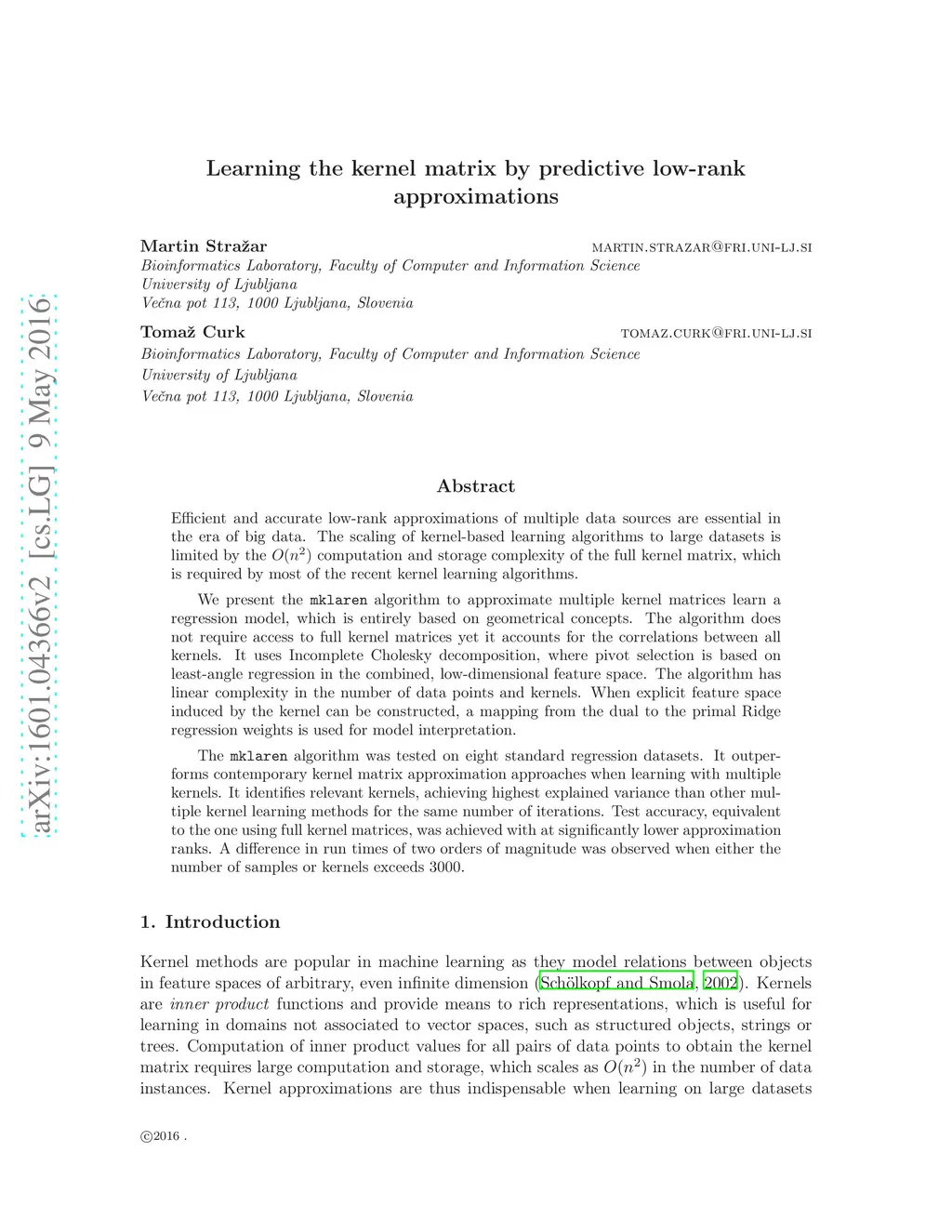 Learning the kernel matrix via predictive low-rank approximations